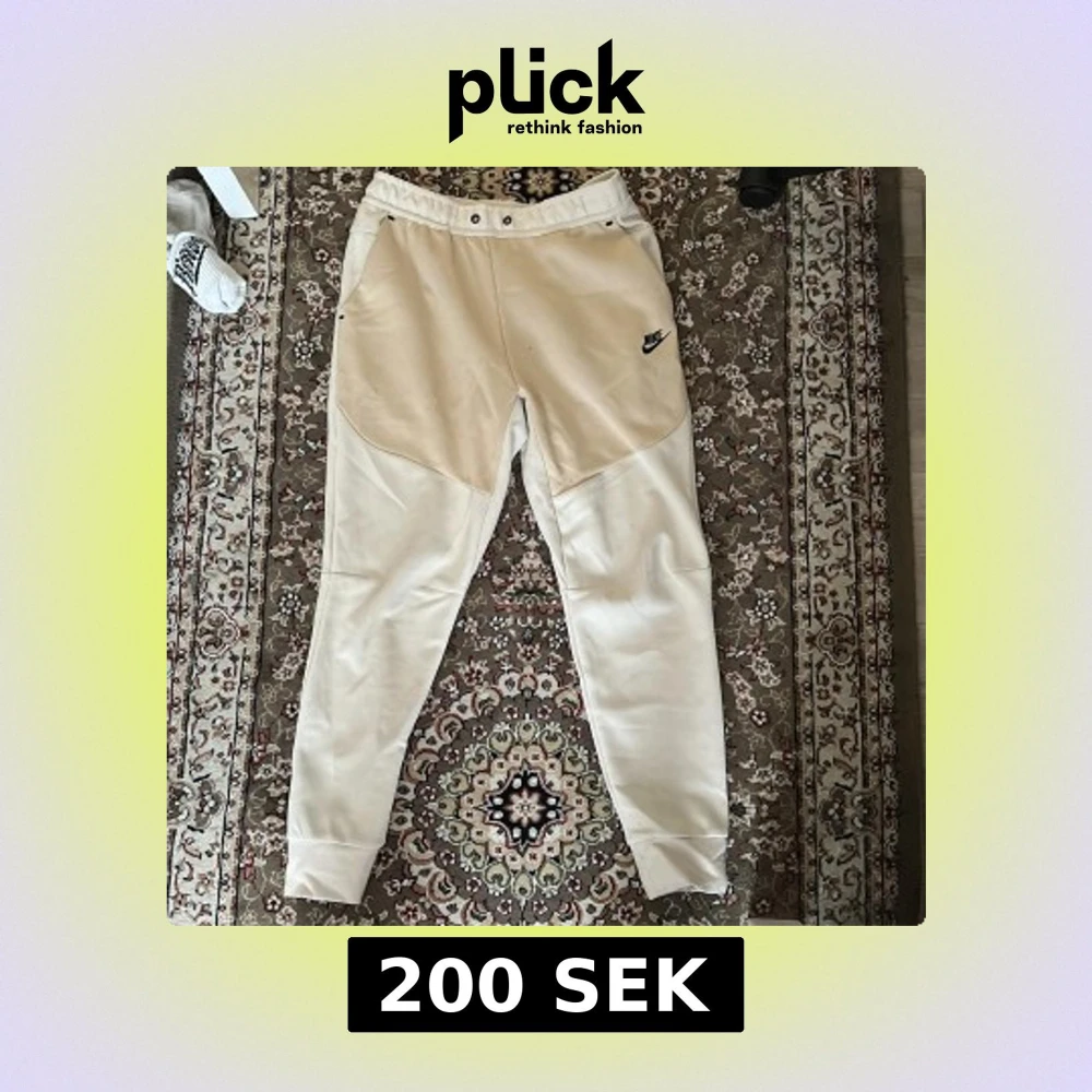 Snygga beige mjukisbyxor från Nike med svarta detaljer och logga på framsidan. Byxorna har elastisk midja, ribbade muddar vid benslut och praktiska fickor, varav en med svart dragkedja. Perfekta för chill eller träning, tillverkade i mjukt bomullsmaterial. Byxorna är i M storlek men de har blivit små, så om man har M kommer det inte att passa, storlek S passar i de.