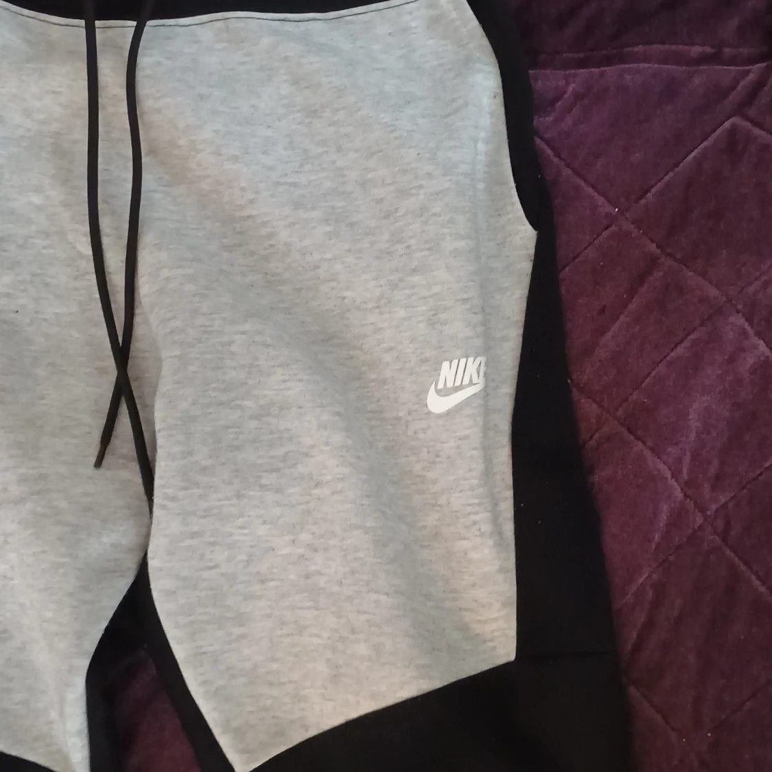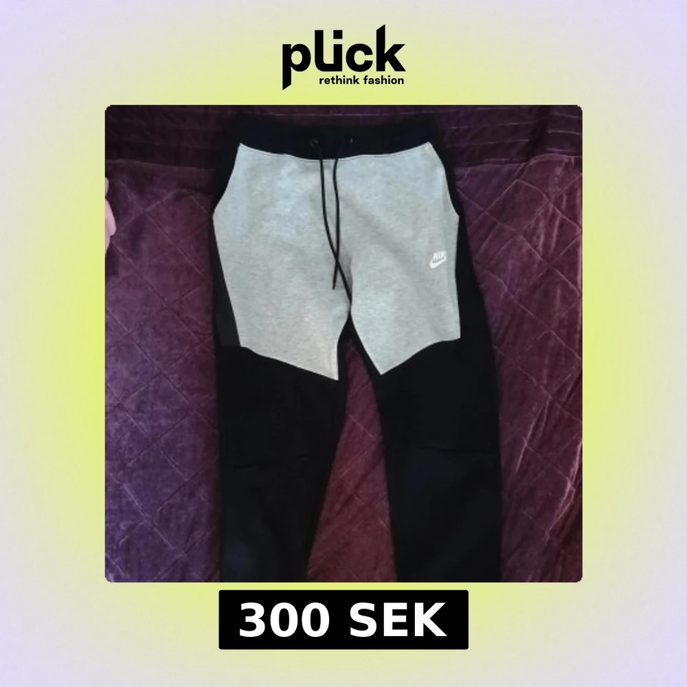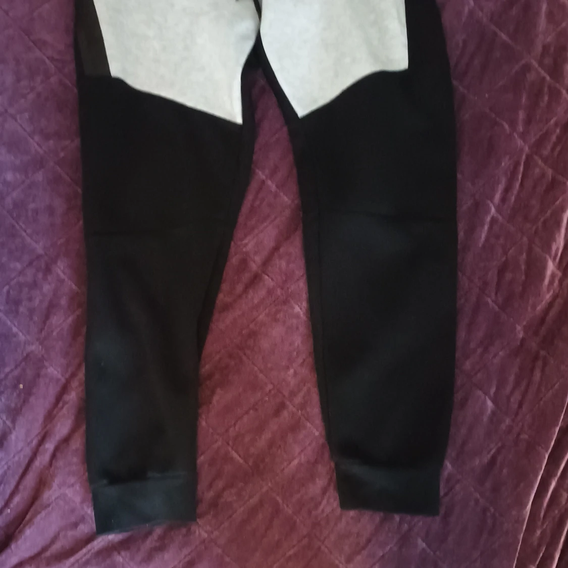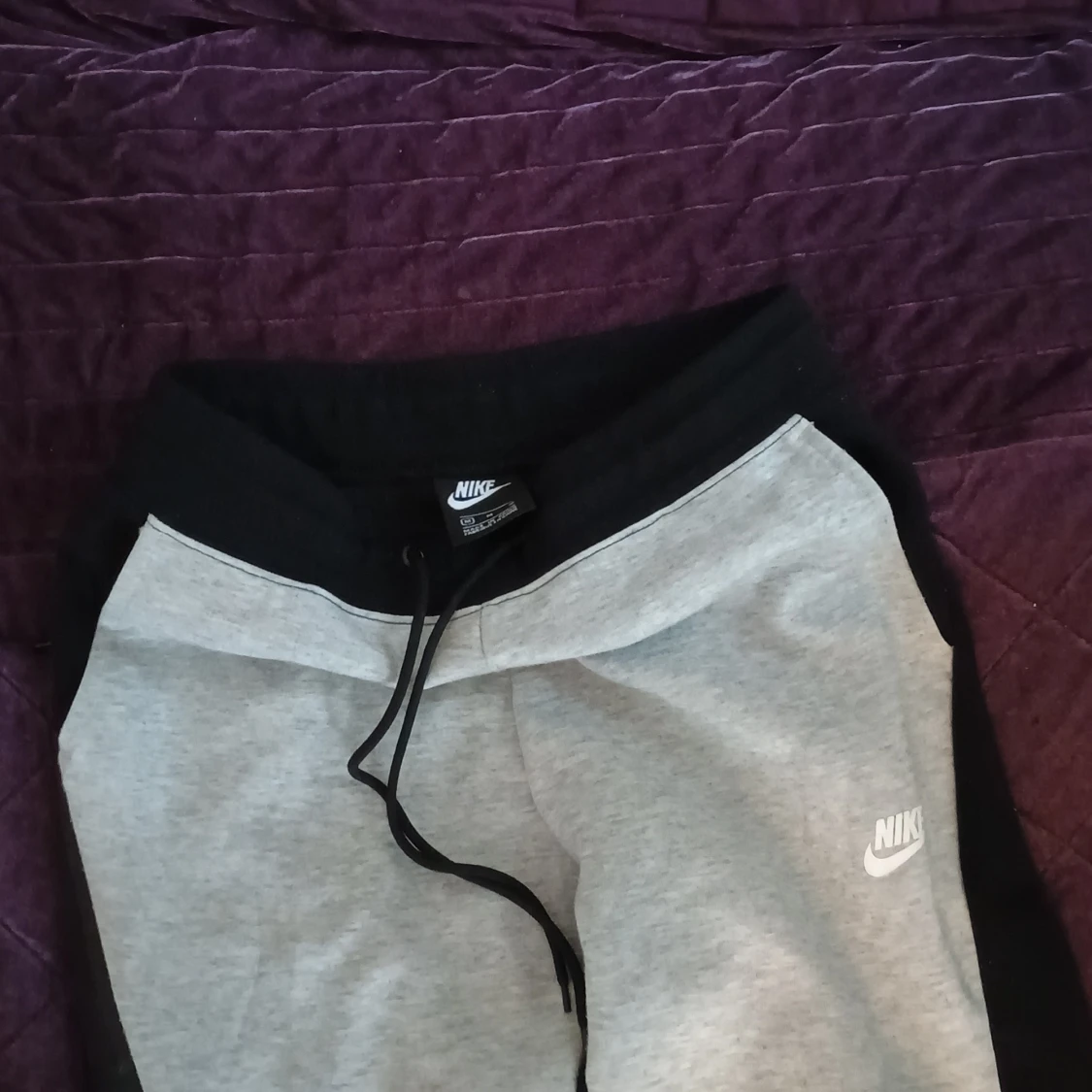 Snygga mjukisbyxor från Nike med svart och ljusgrå färgblock, klassisk logga på benet och snörning i midjan. Perfekta för chill eller träning, med skön passform och mjukt material. Elastiska muddar vid benslut och praktiska fickor på sidorna.