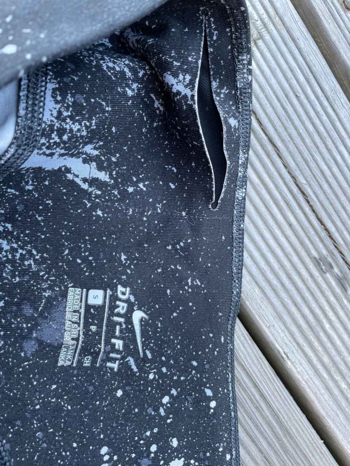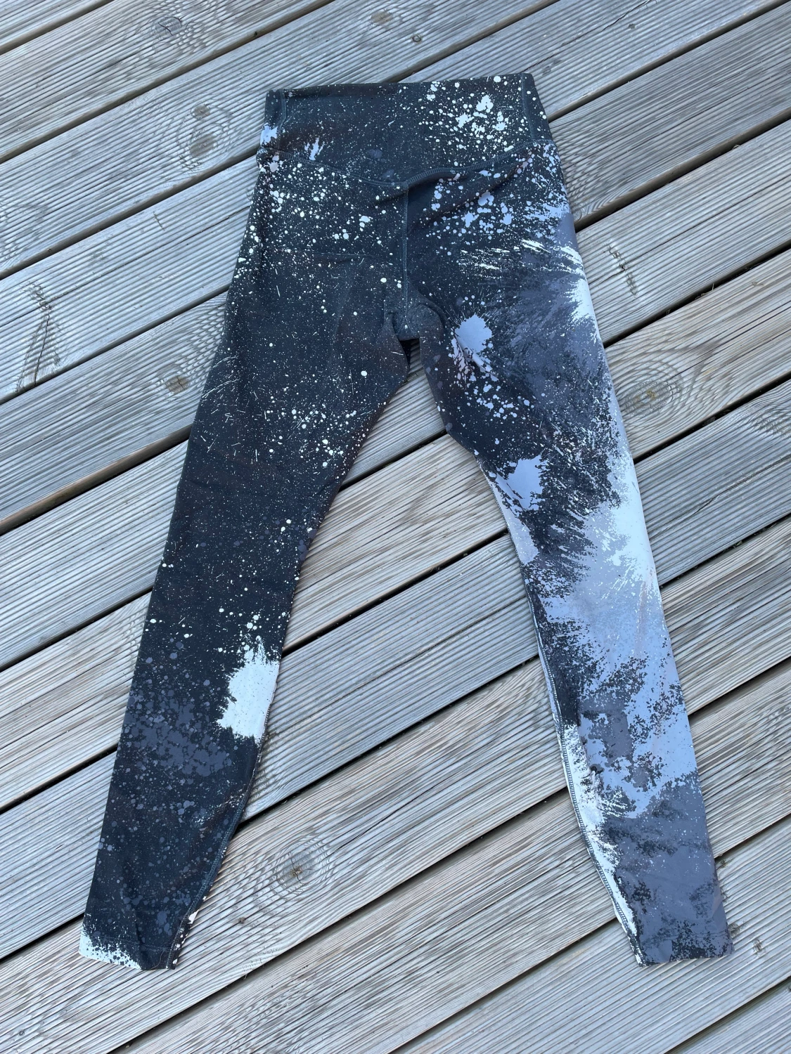 Grå/svart/vita Väldigt sköna och med en lite åtstramande effekt. Mycket fint skick! Liten ficka i baksidan av linningen. Storlek S. 80% nylon, 20% elastan