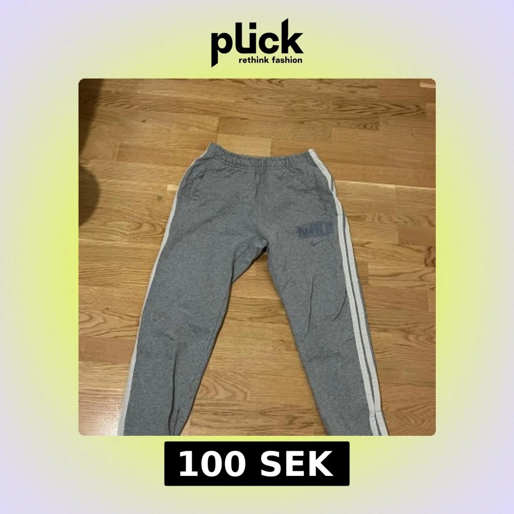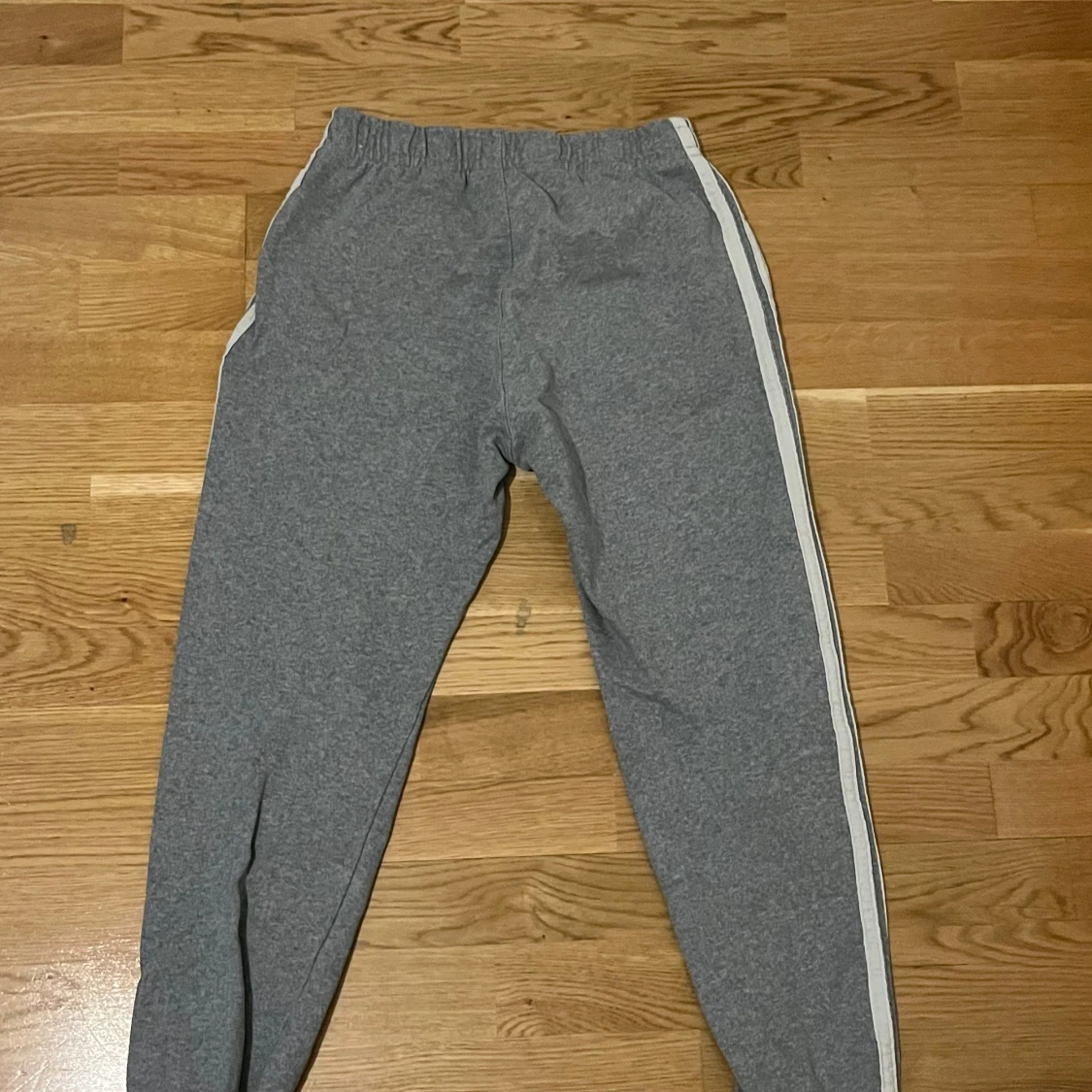 Grå mjukisbyxor från Nike med vita ränder längs sidorna och Nike-logga på vänster lår. Byxorna har resår i midjan och är perfekta för en avslappnad stil.