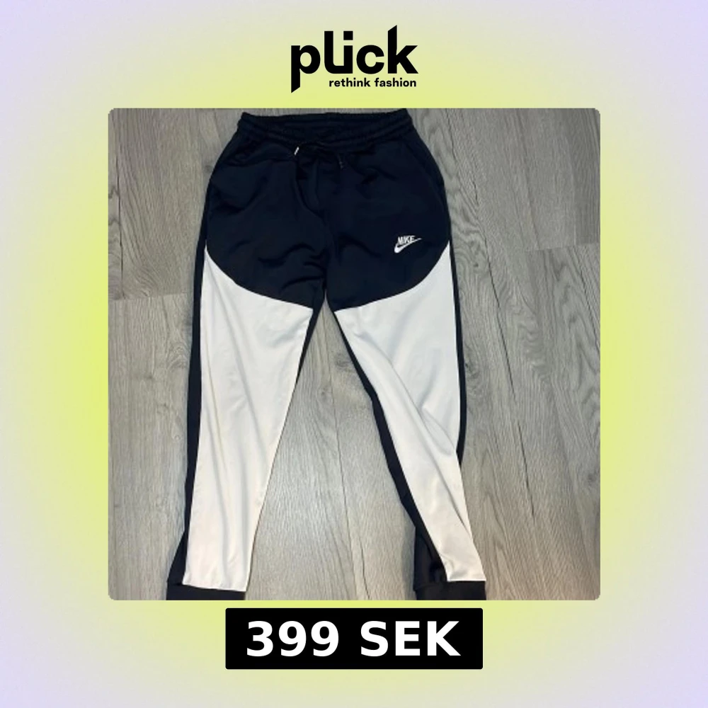 Snygga träningsbyxor från Nike i svart och vitt. De har en elastisk midja med snörning och ett broderat Nike-logotyp på benet. Perfekta för träning eller en avslappnad dag.