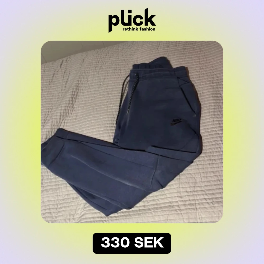 Marineblåa Nike tech byxor. Storlek S. Fint skick förutom en liten defekt som knappt syns, se bild 2