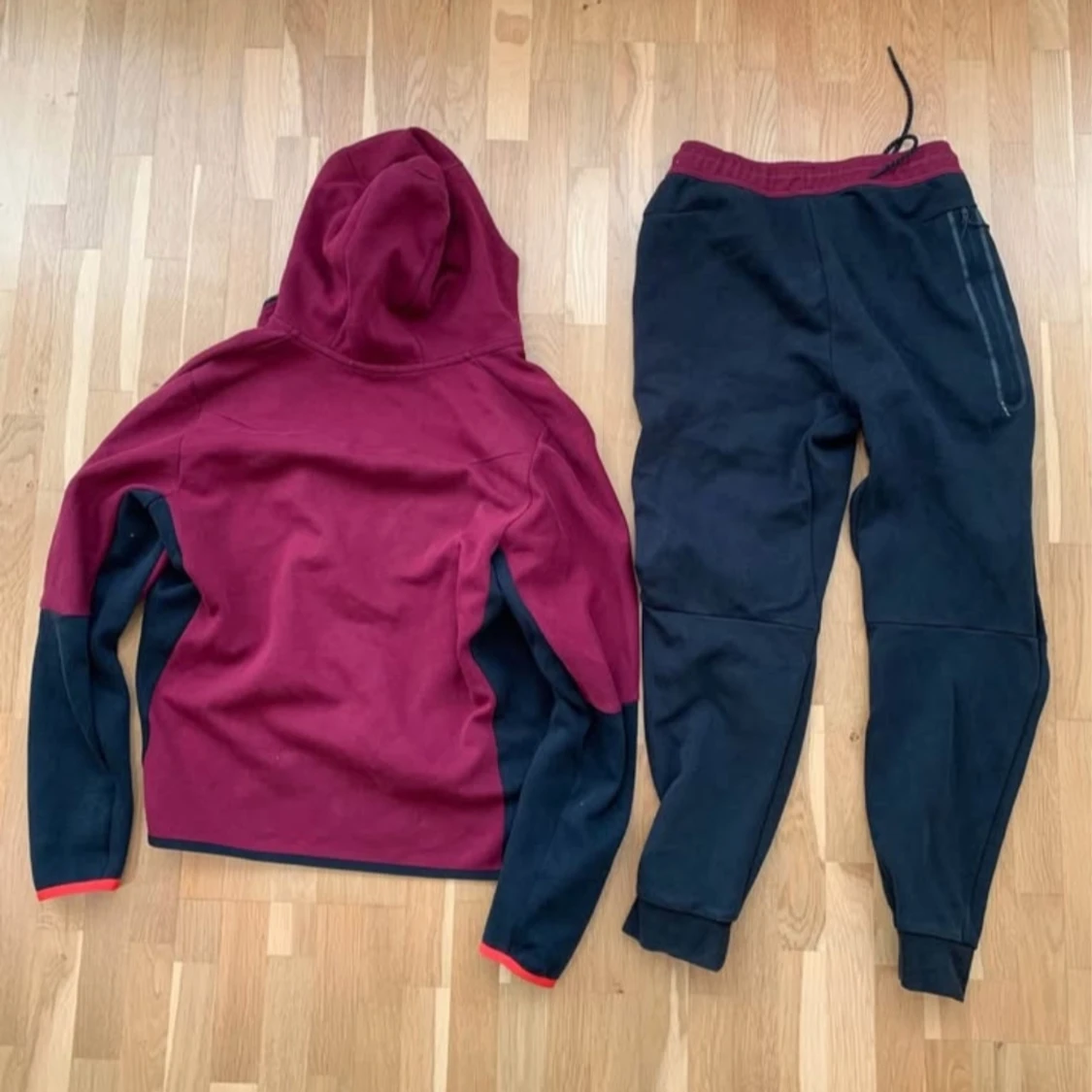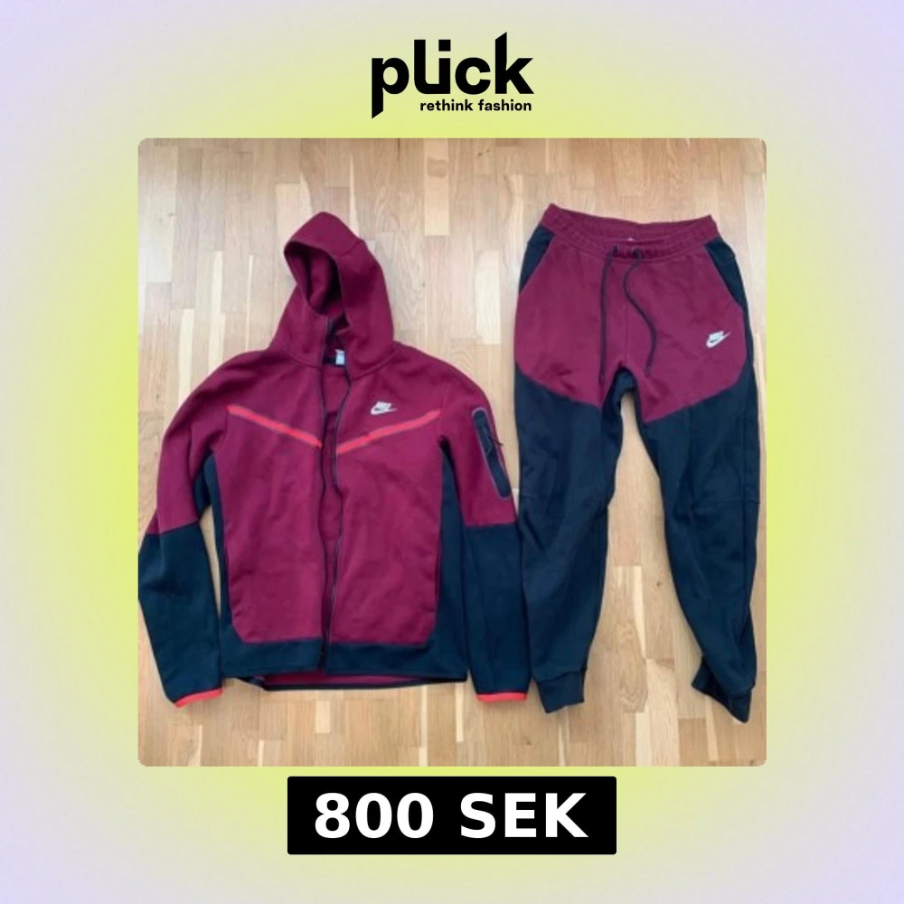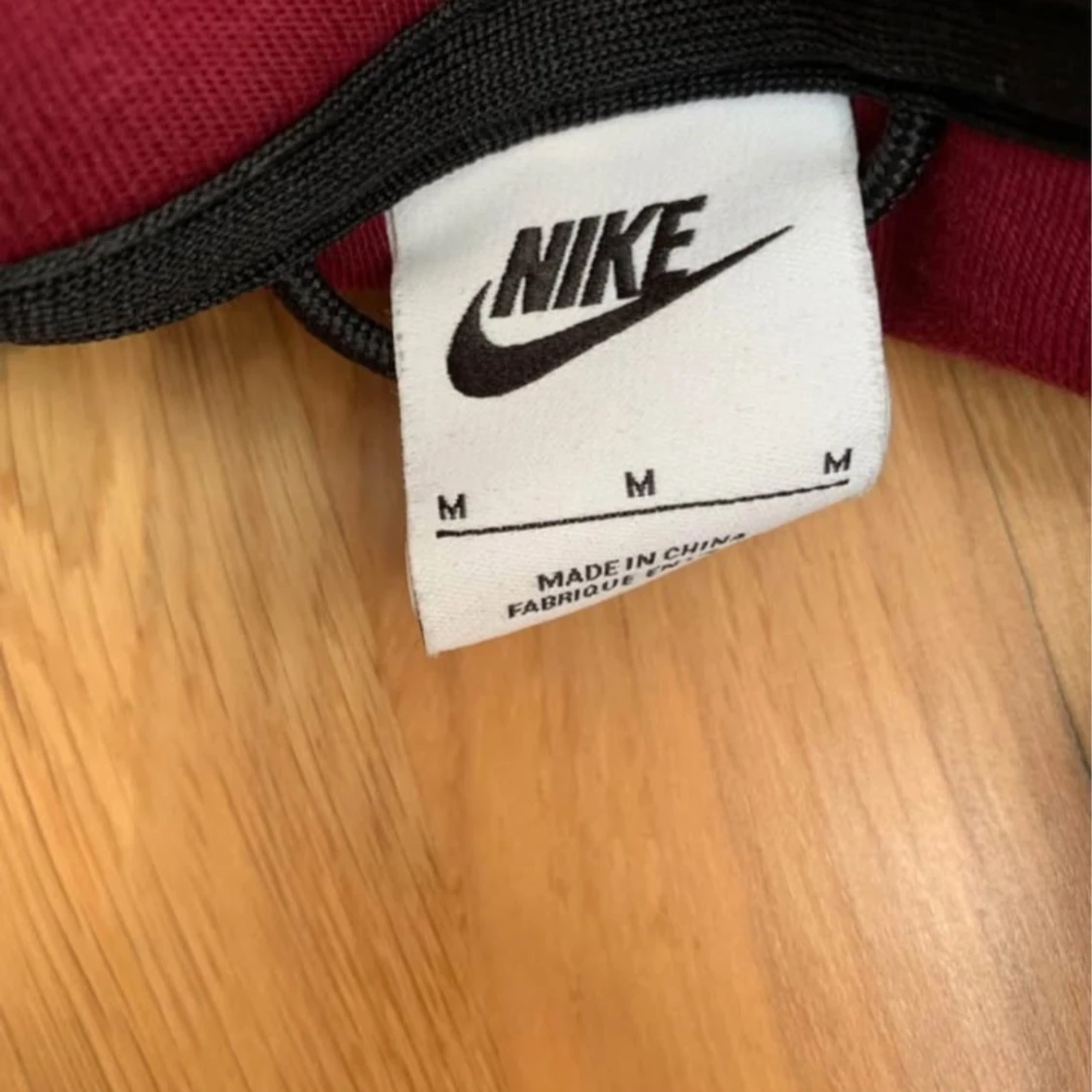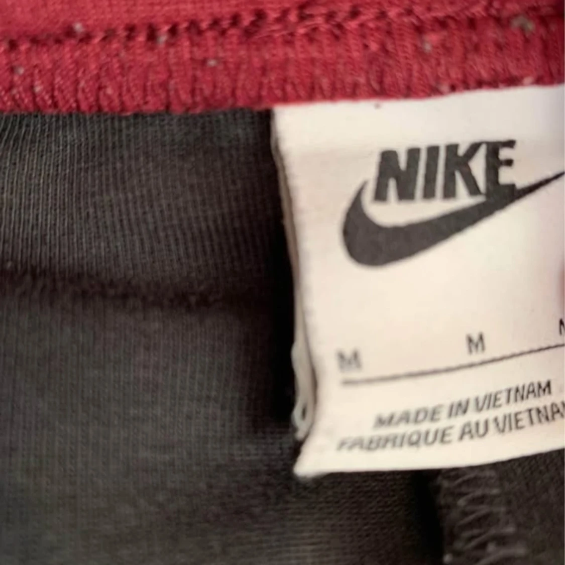 Säljer ett par snygga mjukisbyxor från Nike i vinrött och svart. Byxorna har dragsko i midjan, muddar vid bensluten och klassisk Nike-logga på låret. Perfekta för chill eller träning, tillverkade i mjukt bomullsmaterial för maximal komfort.