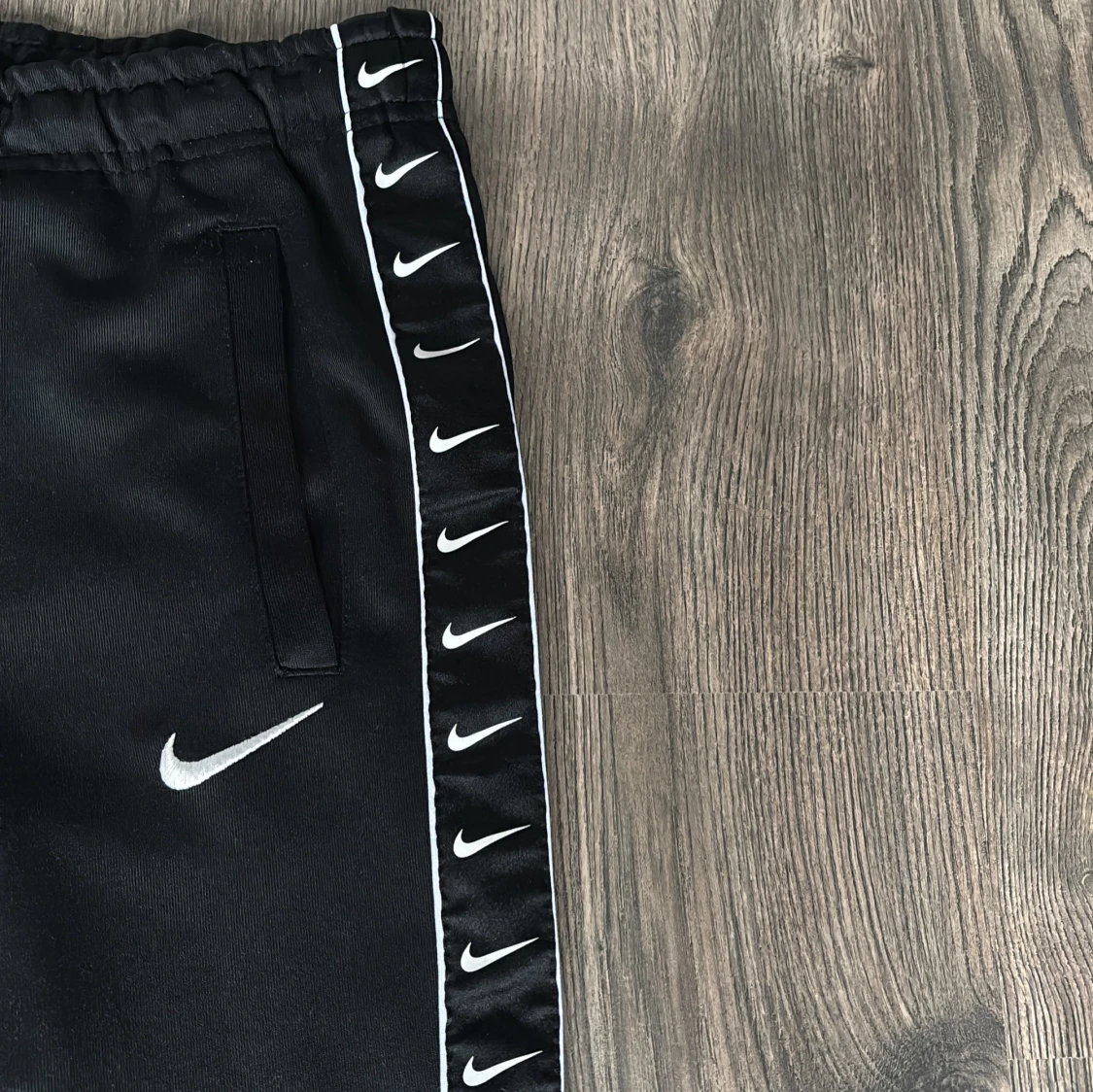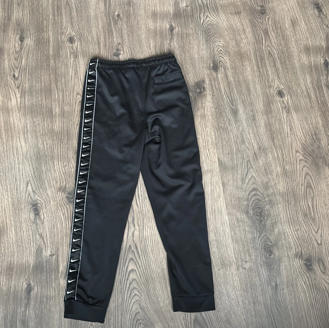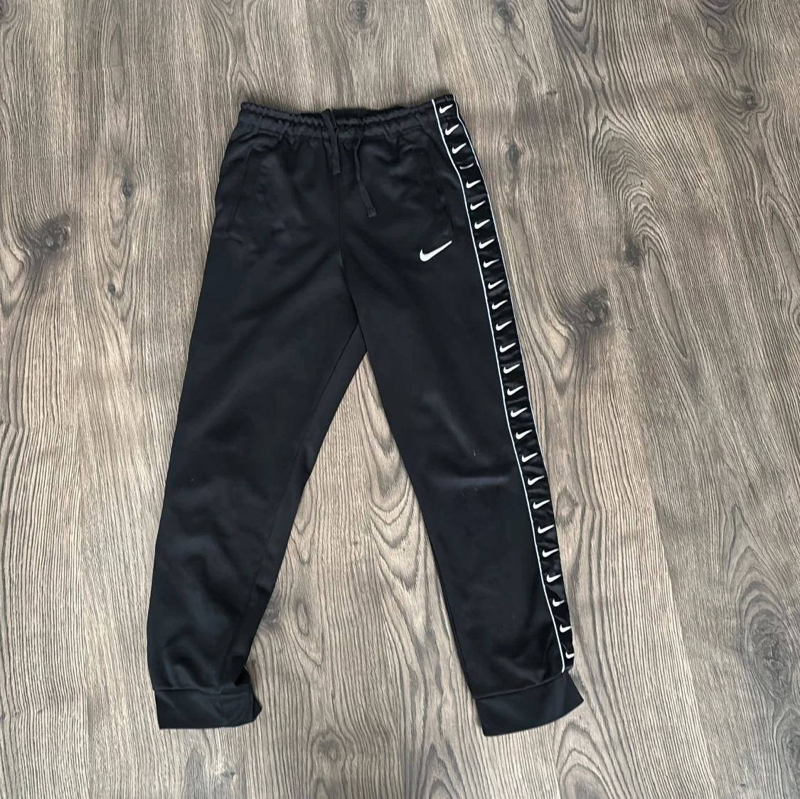 Snygga svarta träningsbyxor från Nike med elastisk midja och snörning. Byxorna har vita Nike-loggor längs sidorna och en liten logga framtill. Perfekta för träning eller en avslappnad dag. PRIS KAN DISKUTERAS!