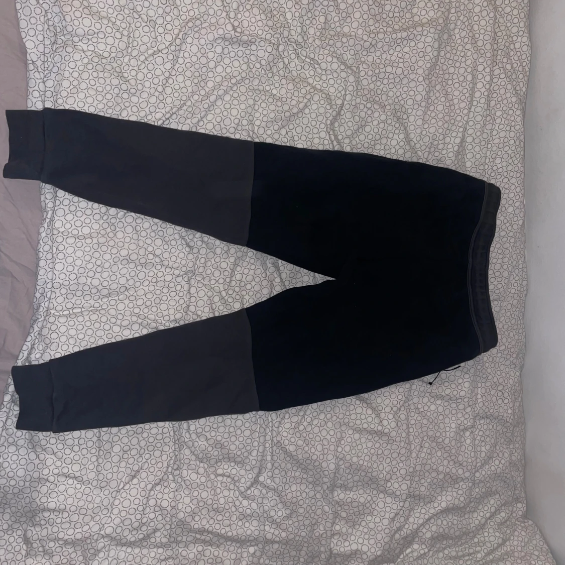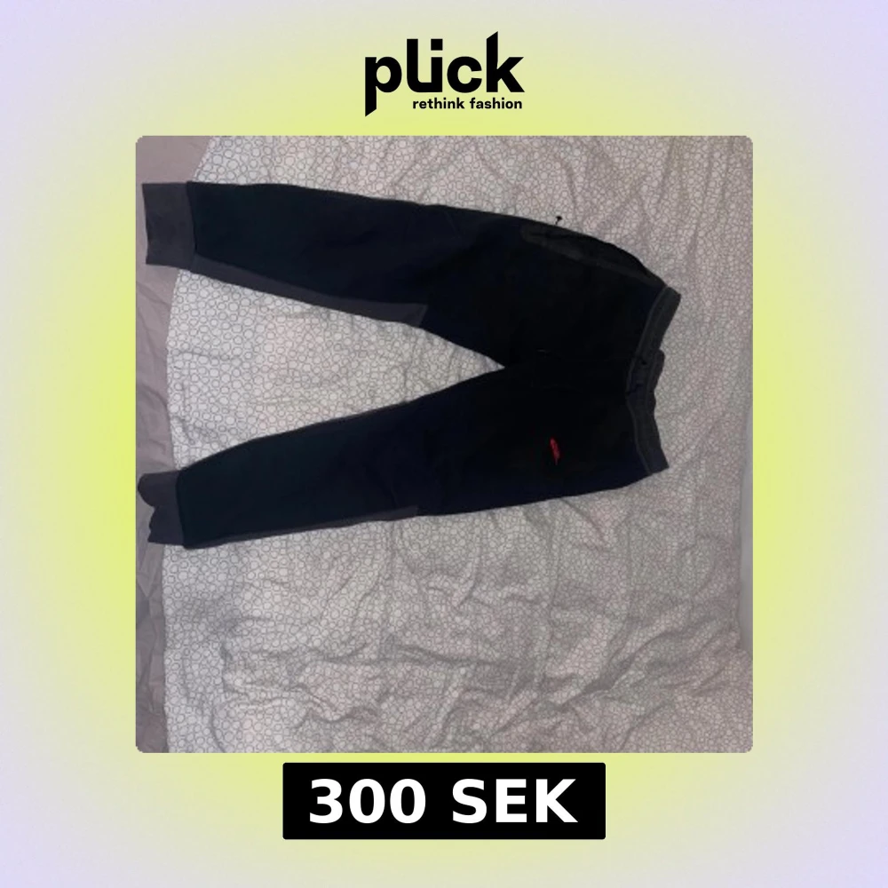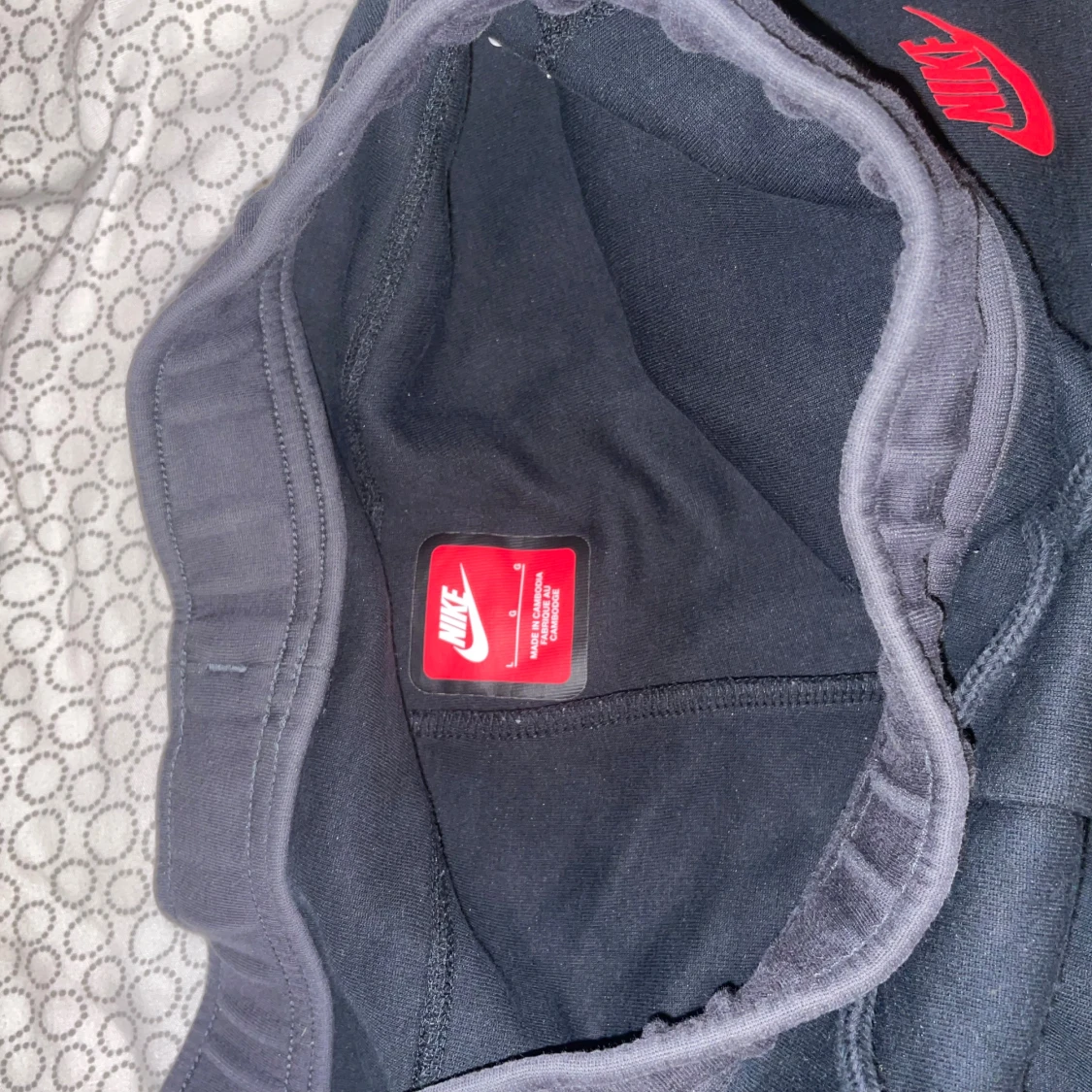 Nike mjukisbyxor i svart med mörkgrå detaljer på benen och muddar vid fotleden. Byxorna har elastisk midja och röd Nike-logga på framsidan. Perfekta för chill eller träning, tillverkade i mjukt bomullsmaterial. Storlek L men passar mig som har M