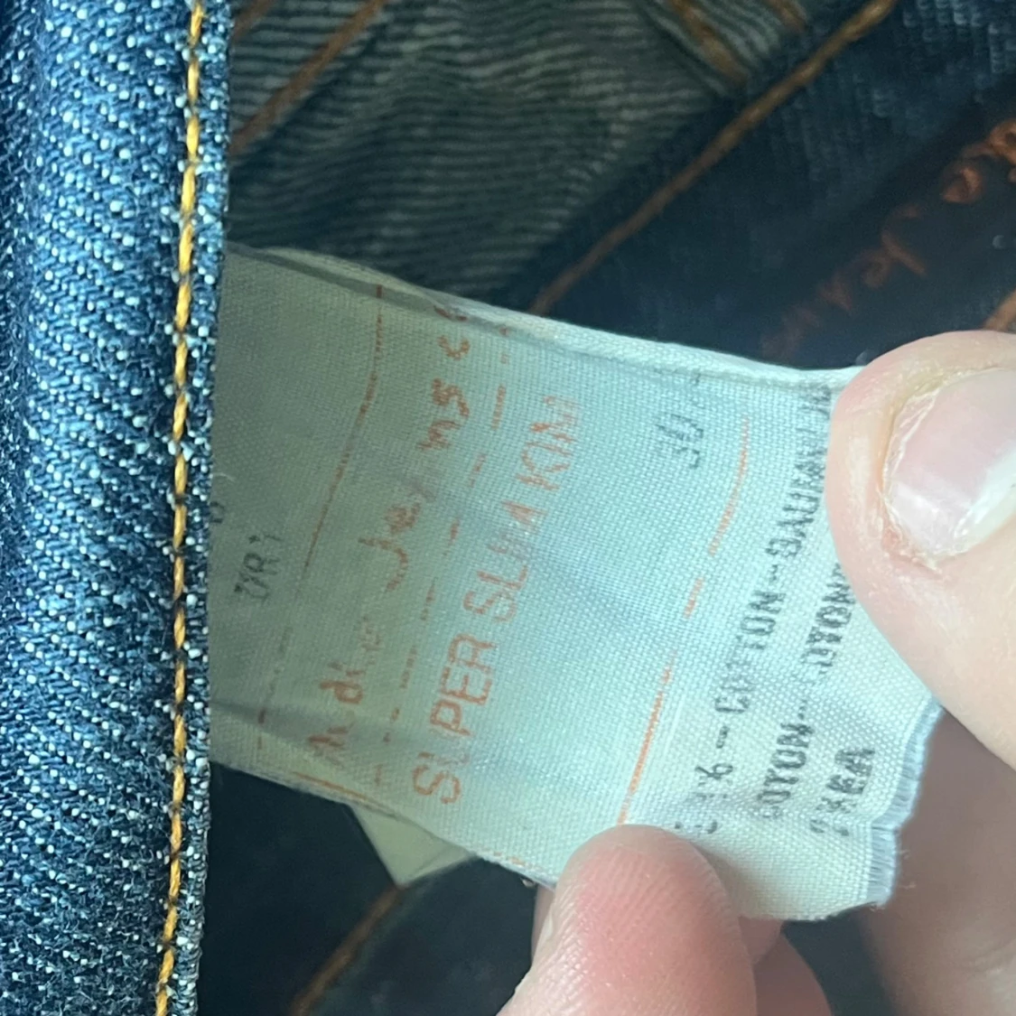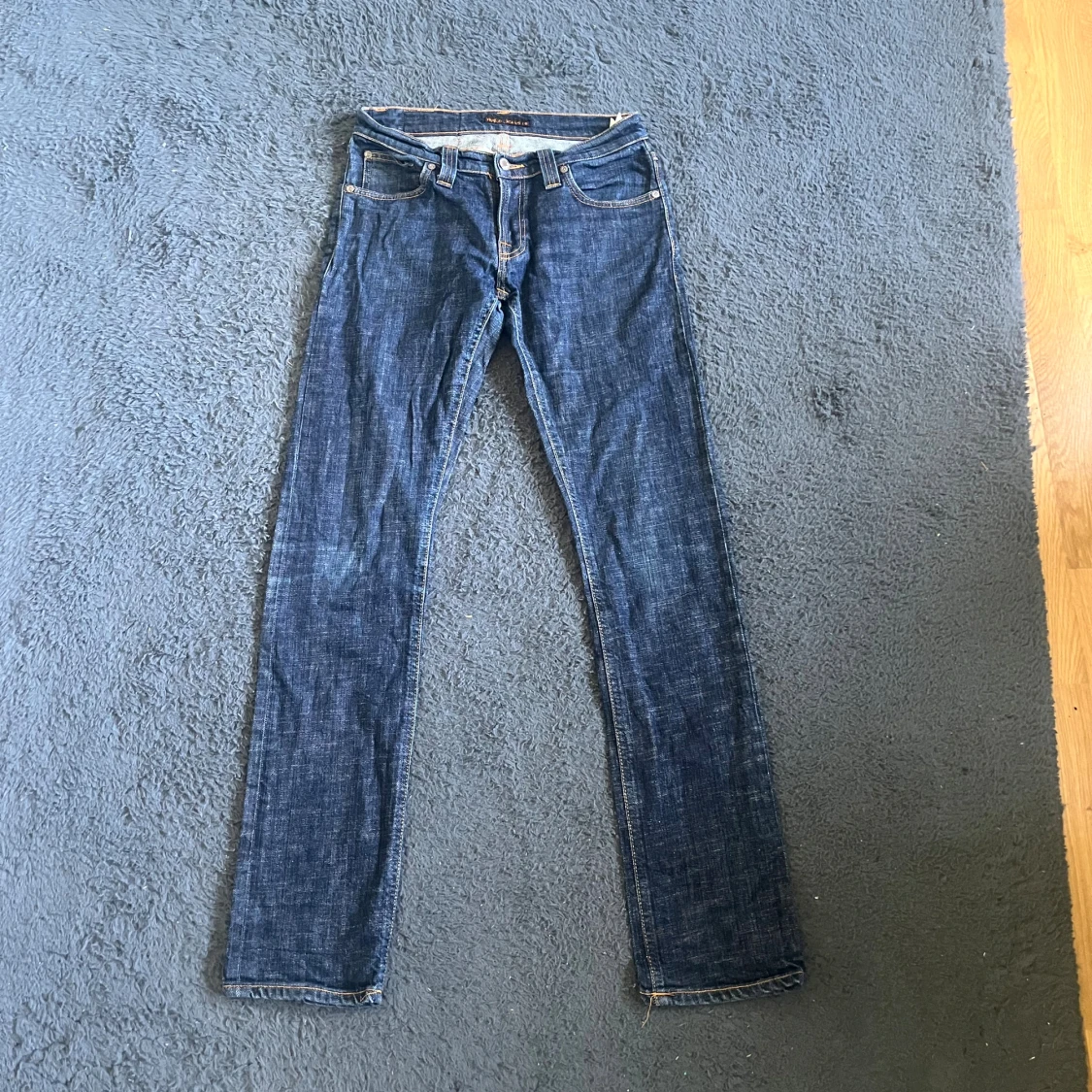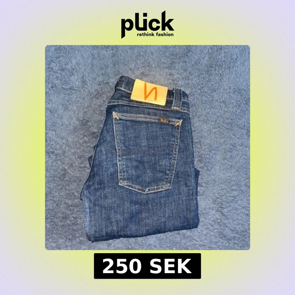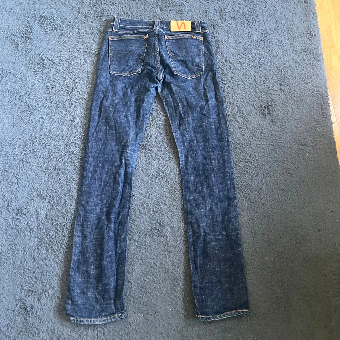 Snygga mörkblå jeans från Nudie Jeans med klassisk femficksdesign och kontrastsömmar. Längd 102cm midja 34cm. W30 men L storleken är utnött så man ej kan se den men jag bedömer den till L32 men utgå ifrån måtten :) Ifall det inte finns någon bild i annonsen där jag bär plaggen jag säljer så är det för att jag ej kan ha storleken heller passformen, så kolla måtten för storlek och googla på modellnamnet för passform 😉 Modell super slim Kim. (Jag vet ej om det är en dam heller herr modell)