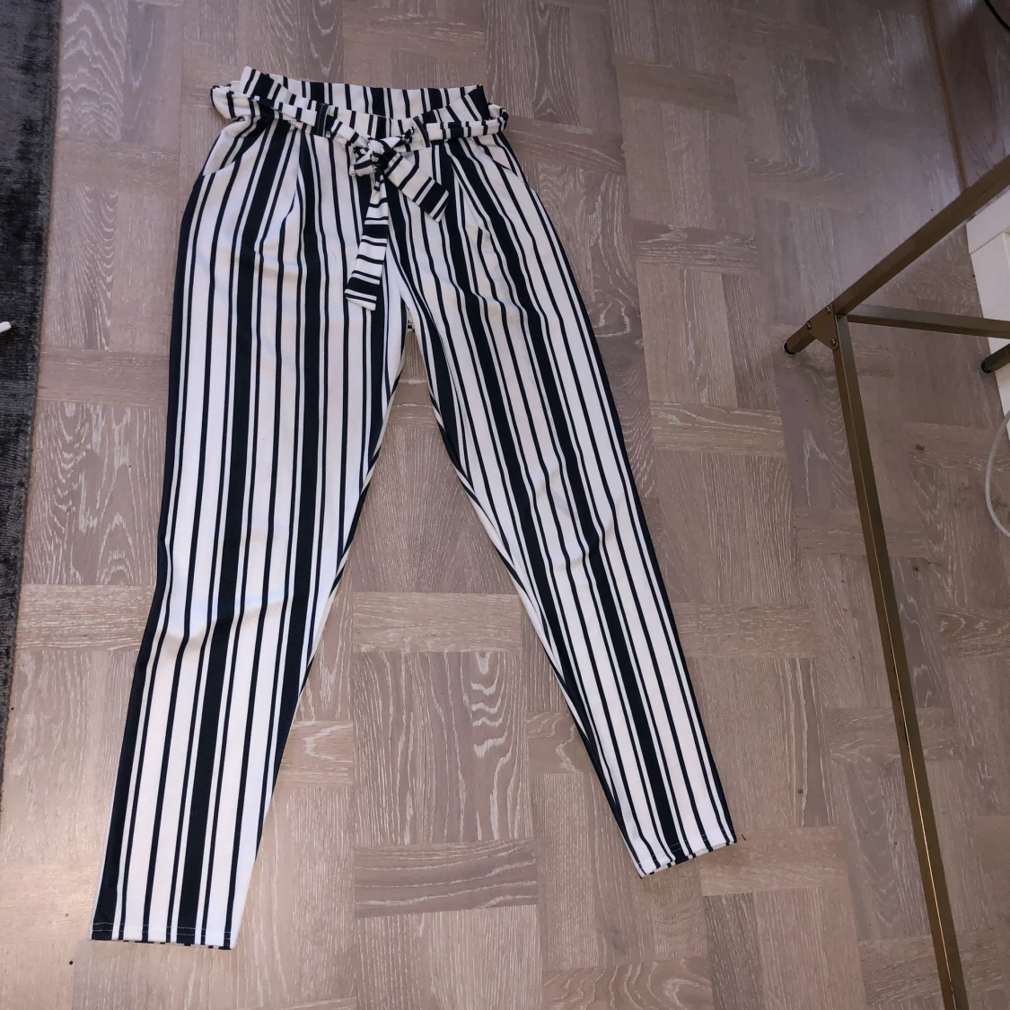 Randiga kostymbyxor med knyt, stretchigt tyg så väldigt sköna och bekväma. Passar S/M. Tyvärr inte kommit till användning mer än 2-3 gånger så de är i bra skick. Kan mötas i Sthlm eller skicka, köparen betalar frakt.
