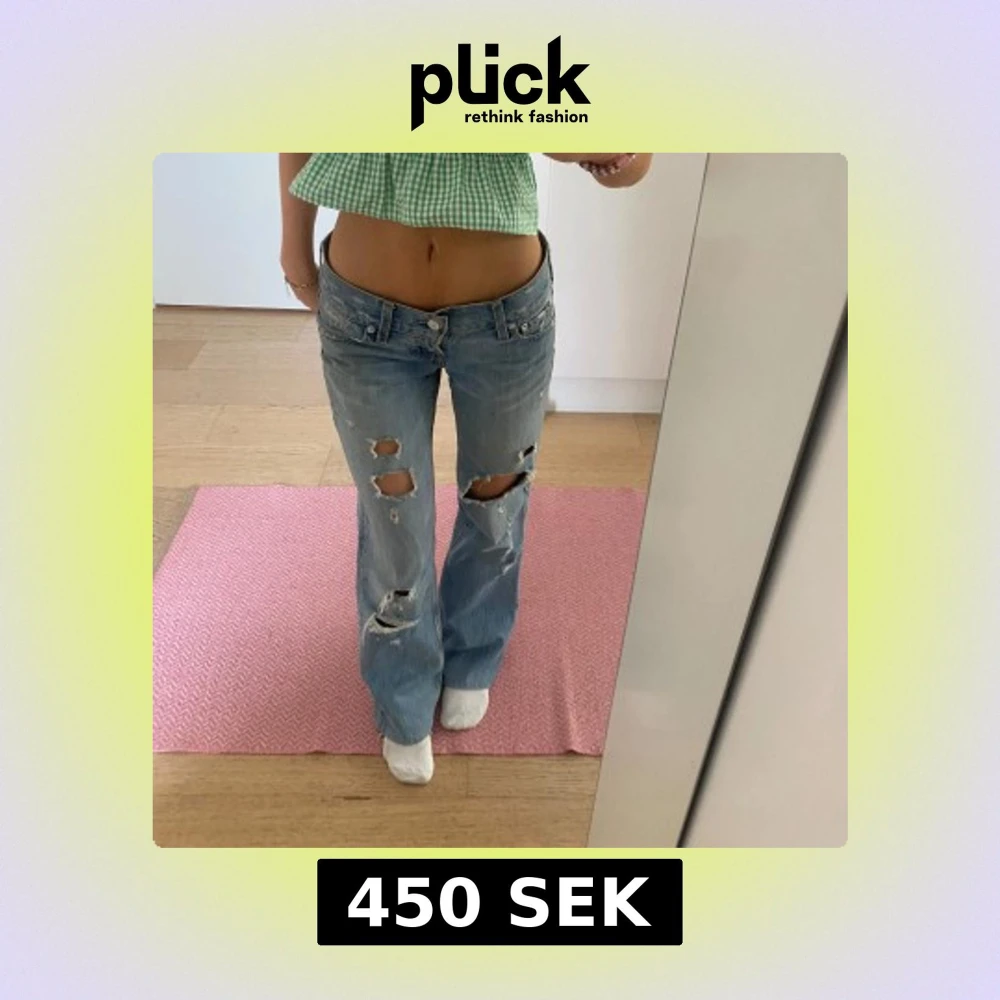 Säljer dessa skit snygga jeans. De är köpta på Plick utan storlek men passar mig som brukar ha 32. Är 160 lång. ( byxorna har ett hål där bak, visas på sista bilderna)