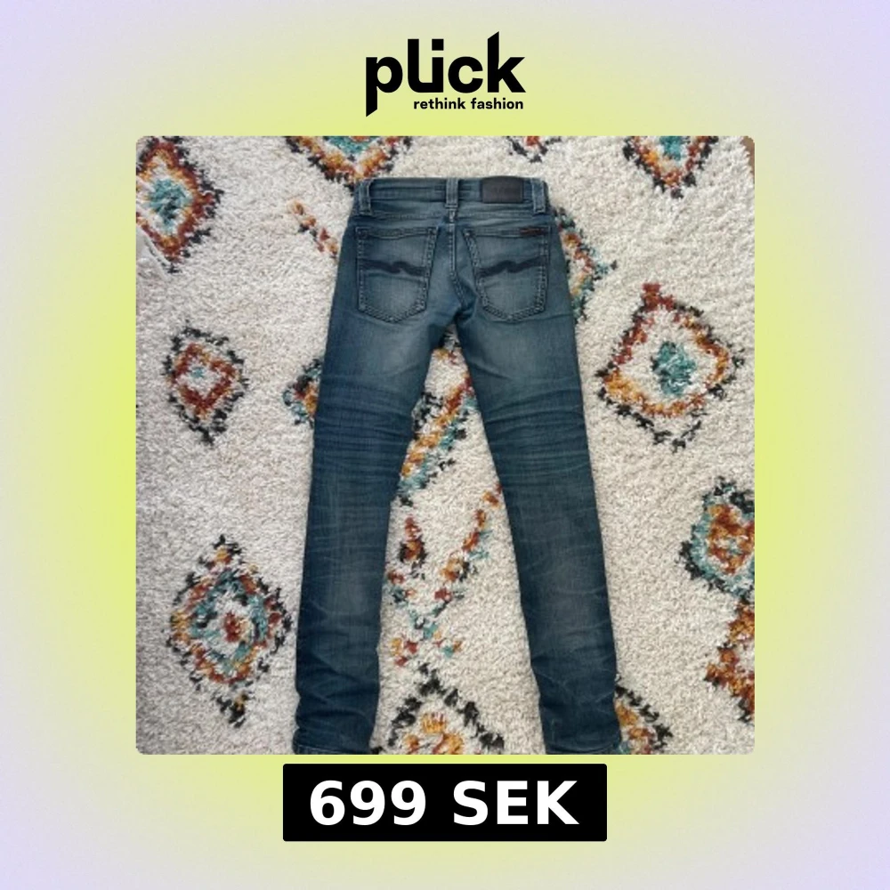 Säljer ett par tighta blå jeans från Nudie Jeans i storlek 24/30. Jeansen har klassisk femficksdesign, slitningar på låren och knän, samt Nudie-logga på bakfickorna. De är i stretchigt denim och har en snygg tvättad look.