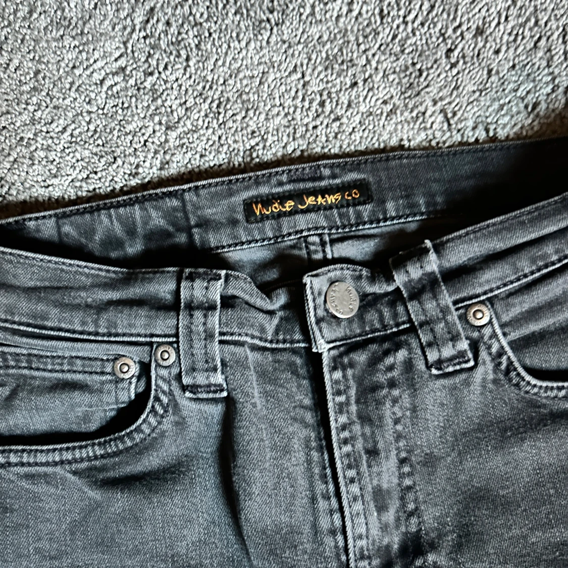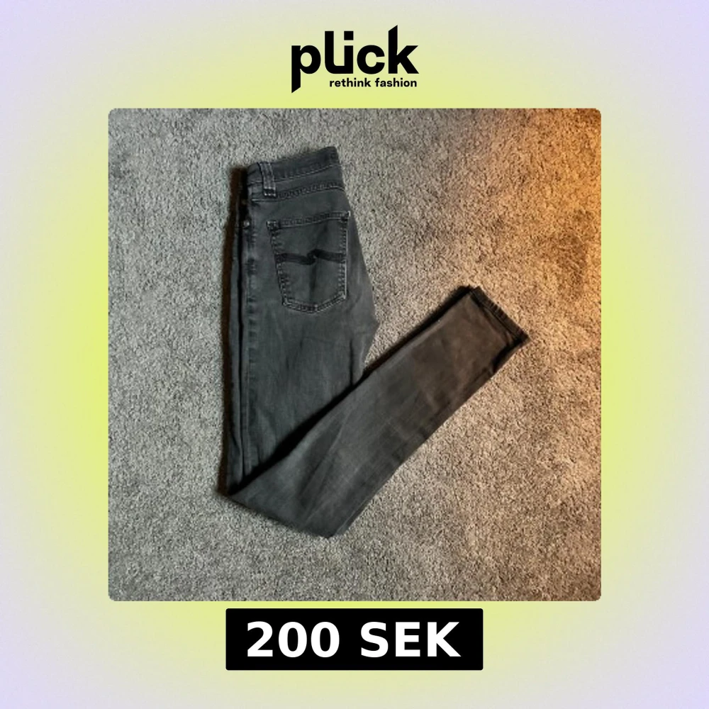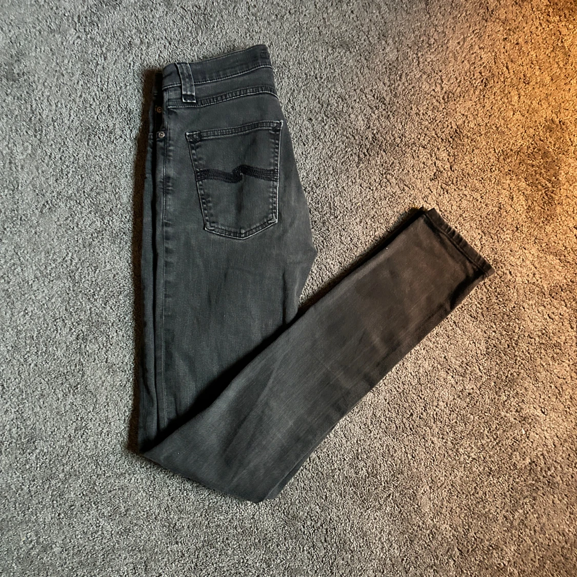 Säljer ett par svarta skinny jeans från Nudie Jeans i storlek 27/34. Jeansen har klassisk femficksdesign, svarta sömmar och Nudie-loggan broderad på bakfickan. Snygg passform med smala ben och normal midja. Perfekta till sneakers eller boots.