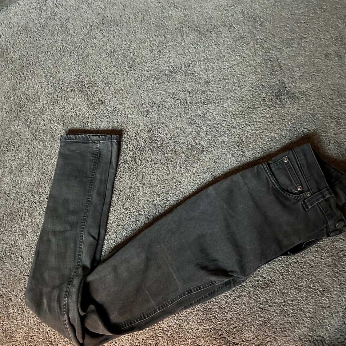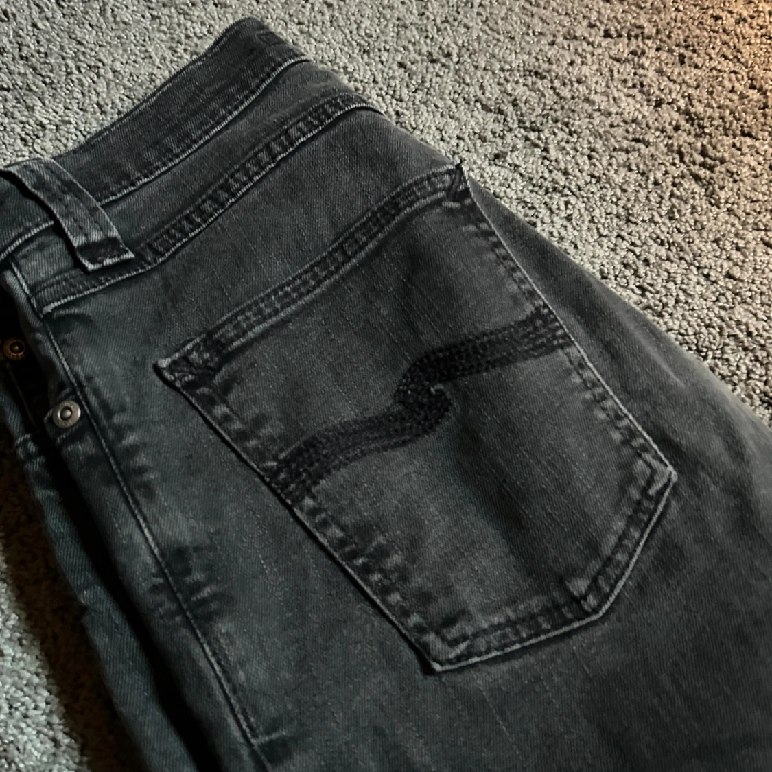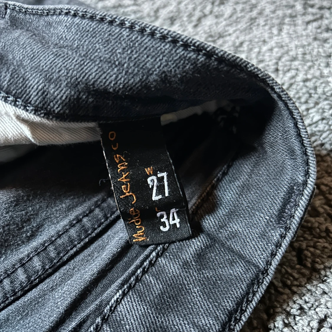 Säljer ett par svarta skinny jeans från Nudie Jeans i storlek 27/34. Jeansen har klassisk femficksdesign, svarta sömmar och Nudie-loggan broderad på bakfickan. Snygg passform med smala ben och normal midja. Perfekta till sneakers eller boots.