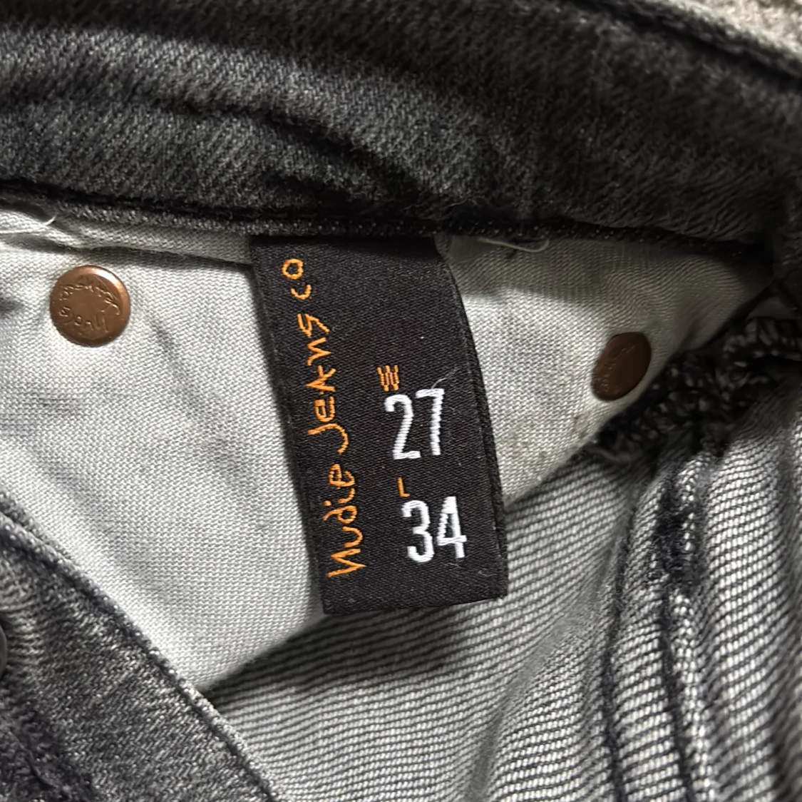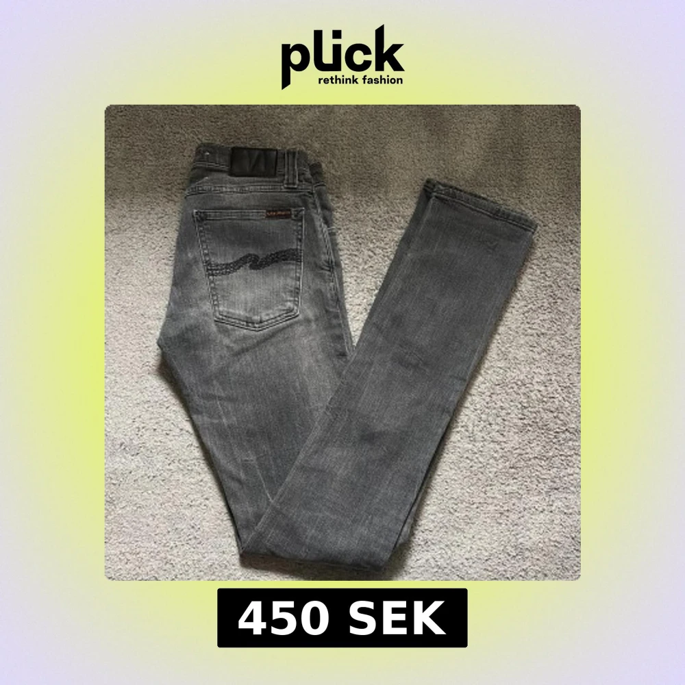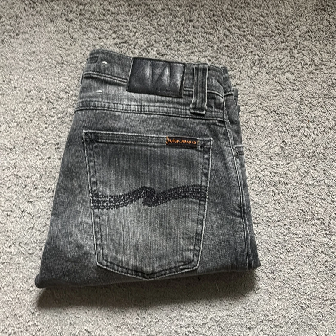 Snygga grå jeans från Nudie Jeans med klassisk femficksdesign och svart broderad våg på bakfickan. Jeansen har en rak passform och är tillverkade i mjukt denimtyg av bomull. Perfekta för dig som gillar stilrena och tidlösa jeans.
