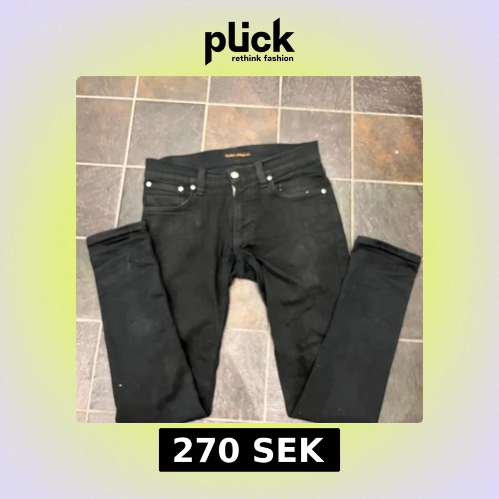 Svarta jeans från Nudie Jeans med klassisk femficksdesign och svarta sömmar. Byxorna har en stilren look med svart patch bak i midjan och Nudie Jeans-logga på bakfickan. Perfekta för dig som gillar lite mer sköna jeans ganska dåliga bilder skriv om du vill ha mer bilder