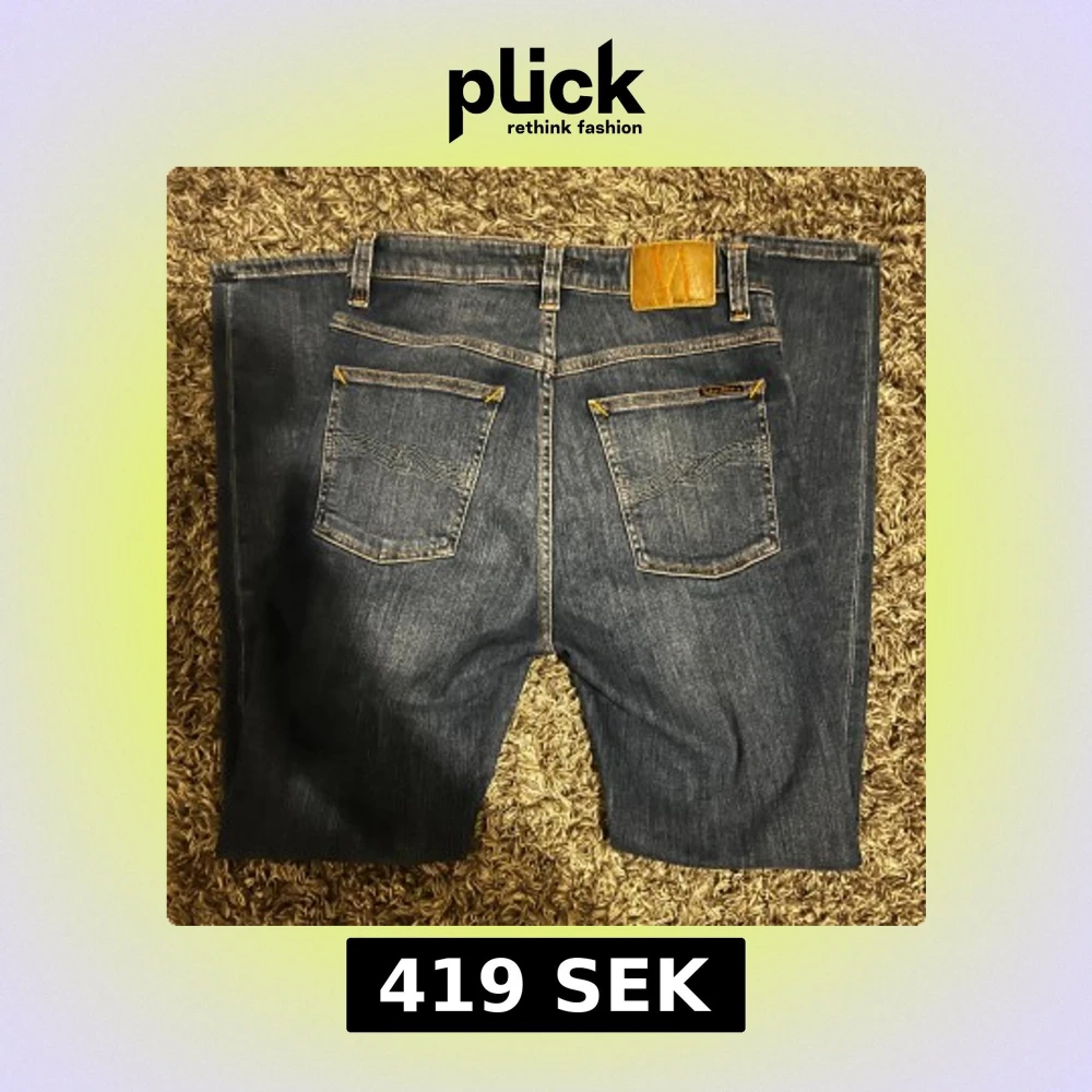Snygga mörkblå slim jeans från Nudie Jeans i storlek 30/30. Klassisk femficksmodell med orangea sömmar och detaljerad brodering på bakfickorna. Jeansen har hög midja och är tillverkade i mjukt jeansmaterial med stretch för extra komfort.
