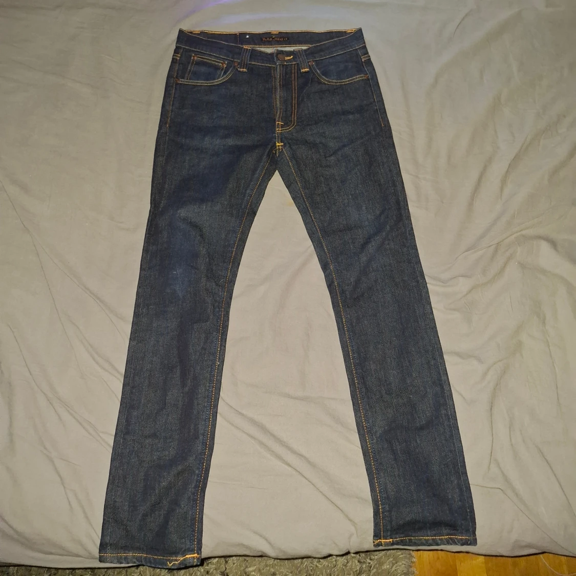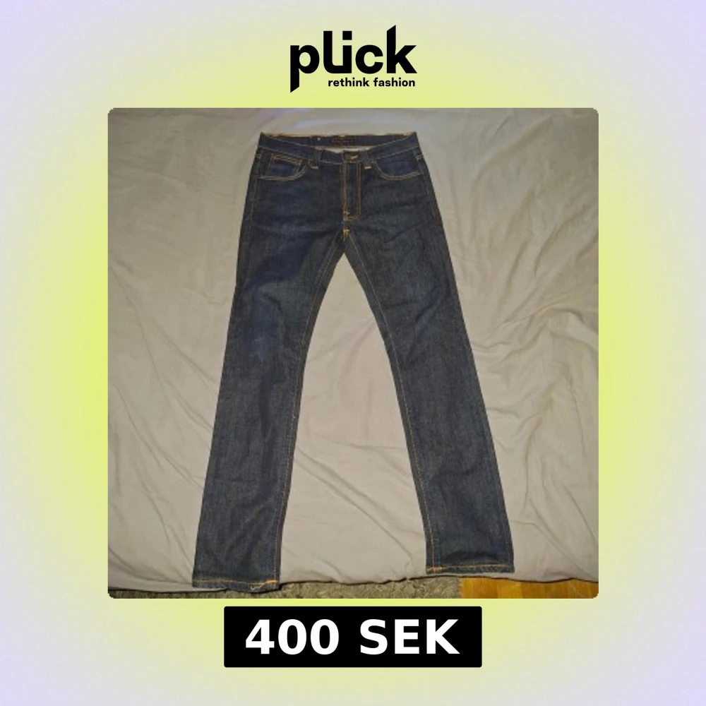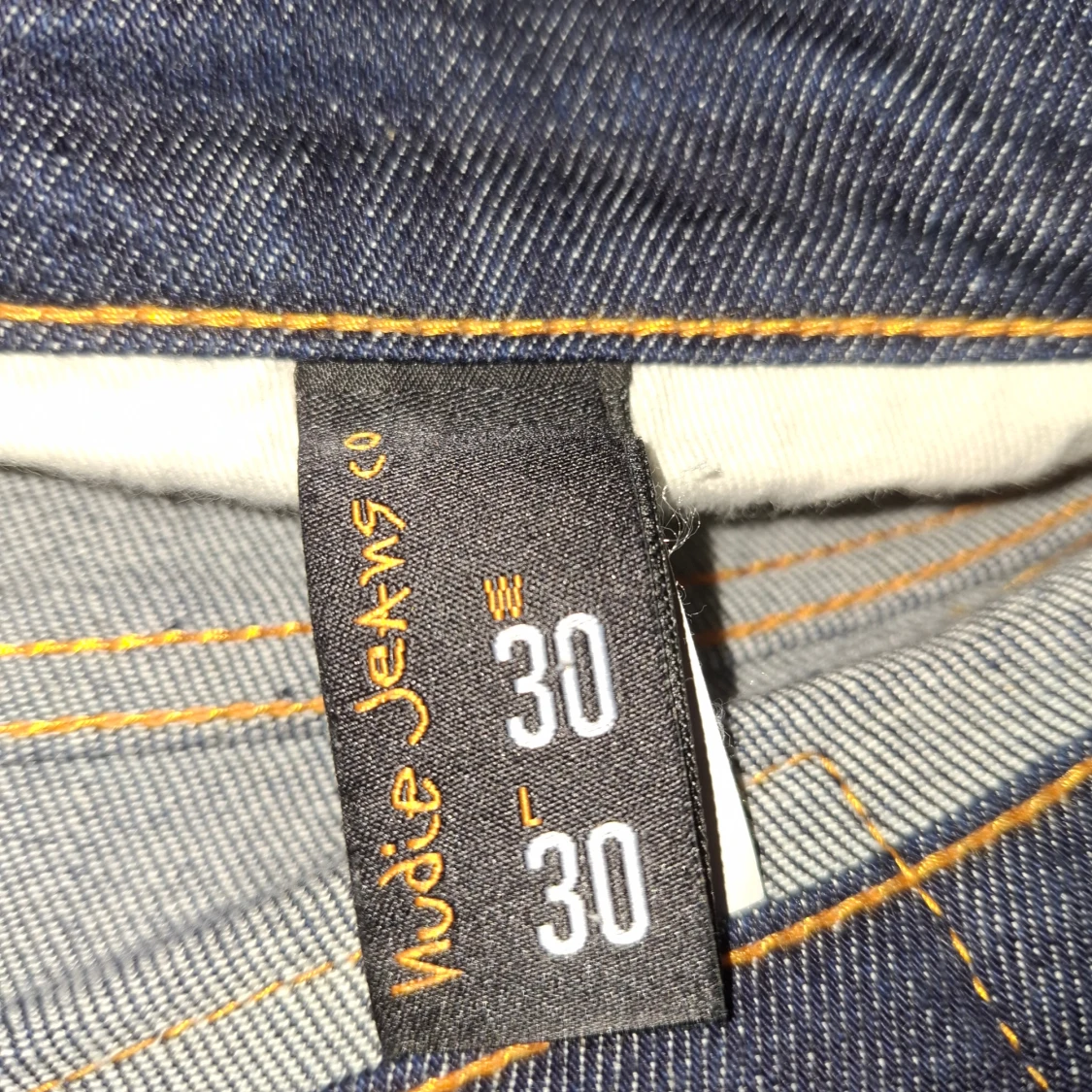 Snygga blå jeans från Nudie Jeans i modellen 30/30. Jeansen är tillverkade av 100% ekologisk bomull och har klassiska orangea sömmar samt Nudie-logga på bakfickorna. Raka ben och normal passform, perfekt för dig som gillar stilrena och tidlösa jeans. Inga defekter, säljs pga för små för mig, helt nya