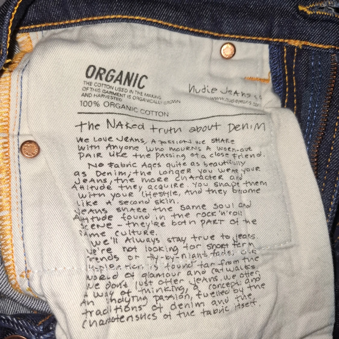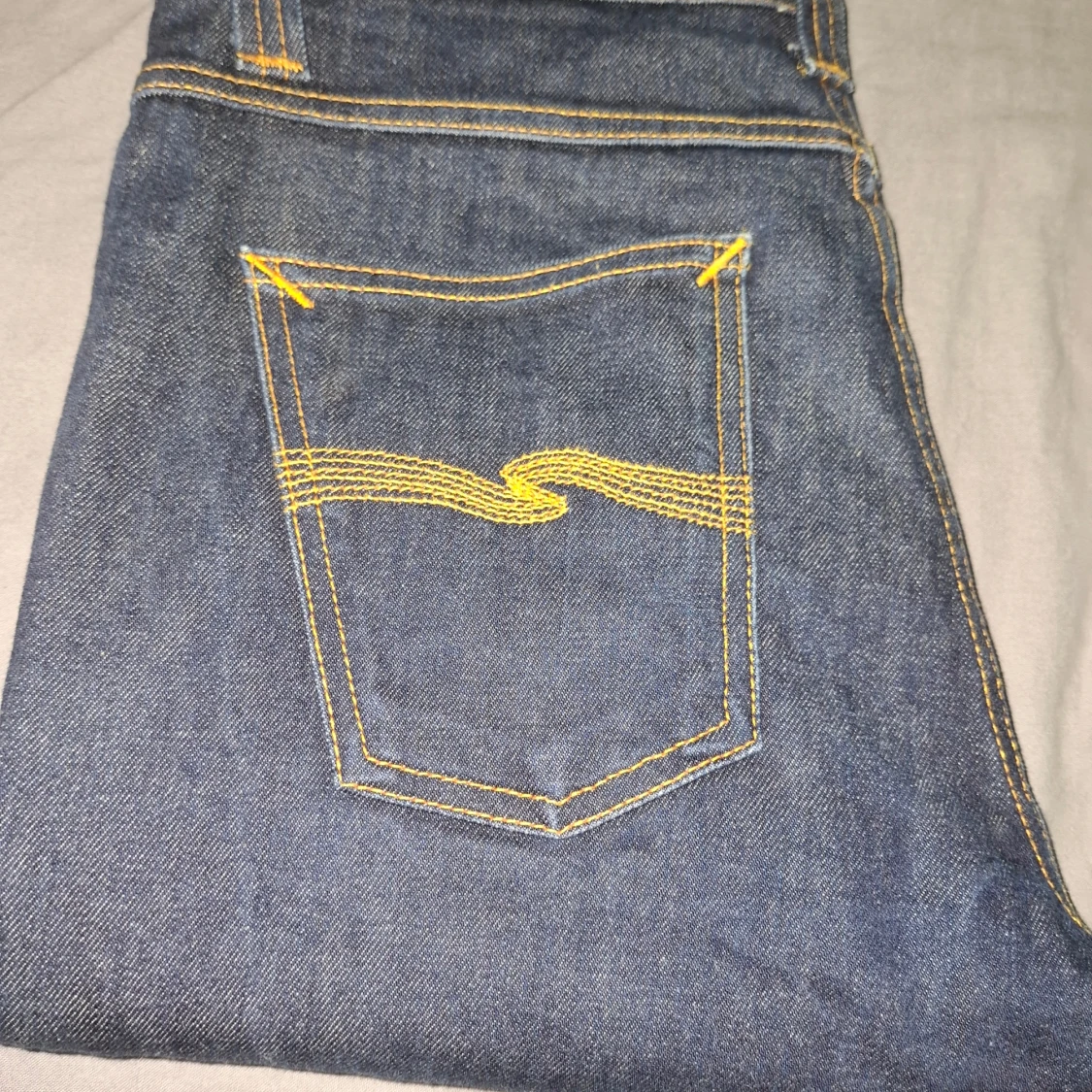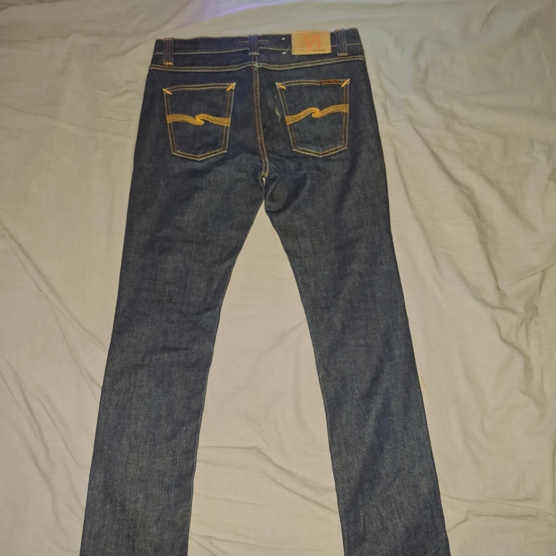 Snygga blå jeans från Nudie Jeans i modellen 30/30. Jeansen är tillverkade av 100% ekologisk bomull och har klassiska orangea sömmar samt Nudie-logga på bakfickorna. Raka ben och normal passform, perfekt för dig som gillar stilrena och tidlösa jeans. Inga defekter, säljs pga för små för mig, helt nya