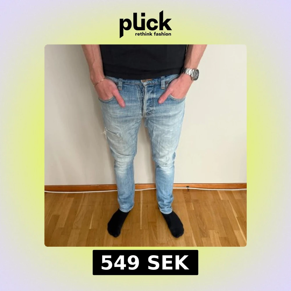 Trendigaste jeansen just nu! Säljer dessa snygga Nudie grin Tim med slitningar. Jeansen är i bra skick, dock är fickan lite trasig på insidan, inget som påverkar funktionaliteten och det går enkelt att sy ihop för den händige. Modellen är 186 cm lång.
