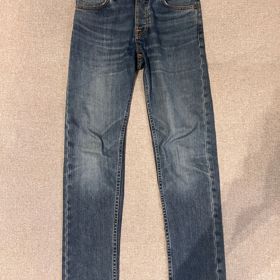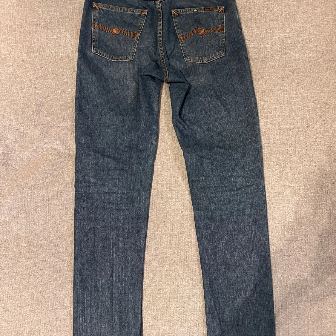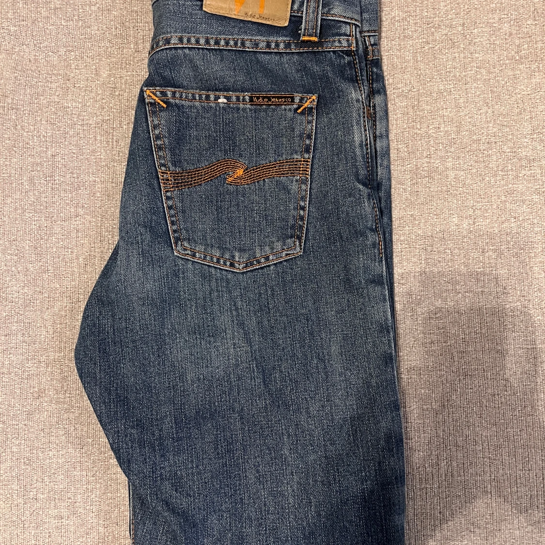 Snygga blå jeans från Nudie Jeans med klassisk femficksdesign och orange sömmar. Jeansen har en rak passform och är tillverkade i slitstarkt denim. Perfekta för en avslappnad stil. Säljer pga att de inte passar mig, använt fåtal gånger. Storlek W28 L32.