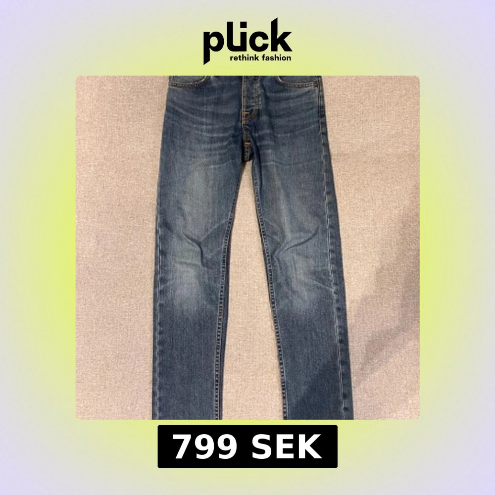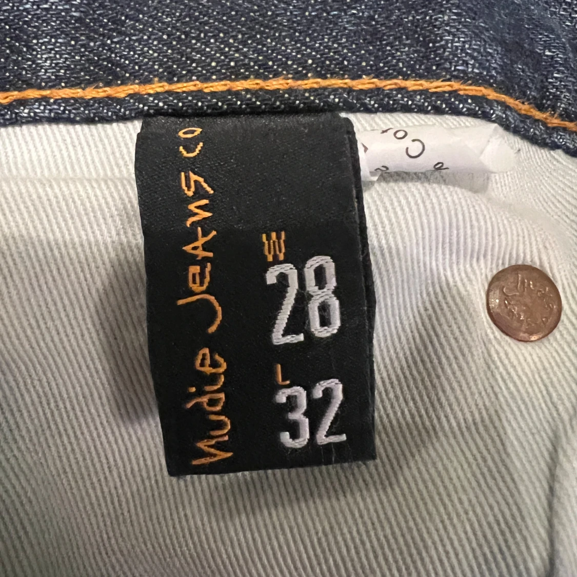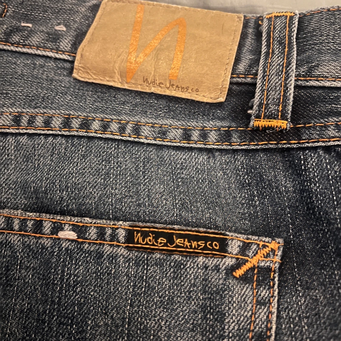 Snygga blå jeans från Nudie Jeans med klassisk femficksdesign och orange sömmar. Jeansen har en rak passform och är tillverkade i slitstarkt denim. Perfekta för en avslappnad stil. Säljer pga att de inte passar mig, använt fåtal gånger. Storlek W28 L32.