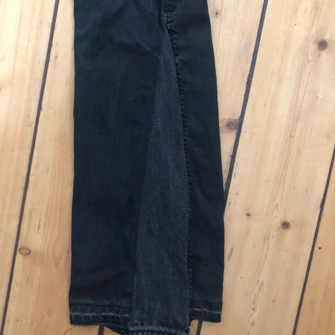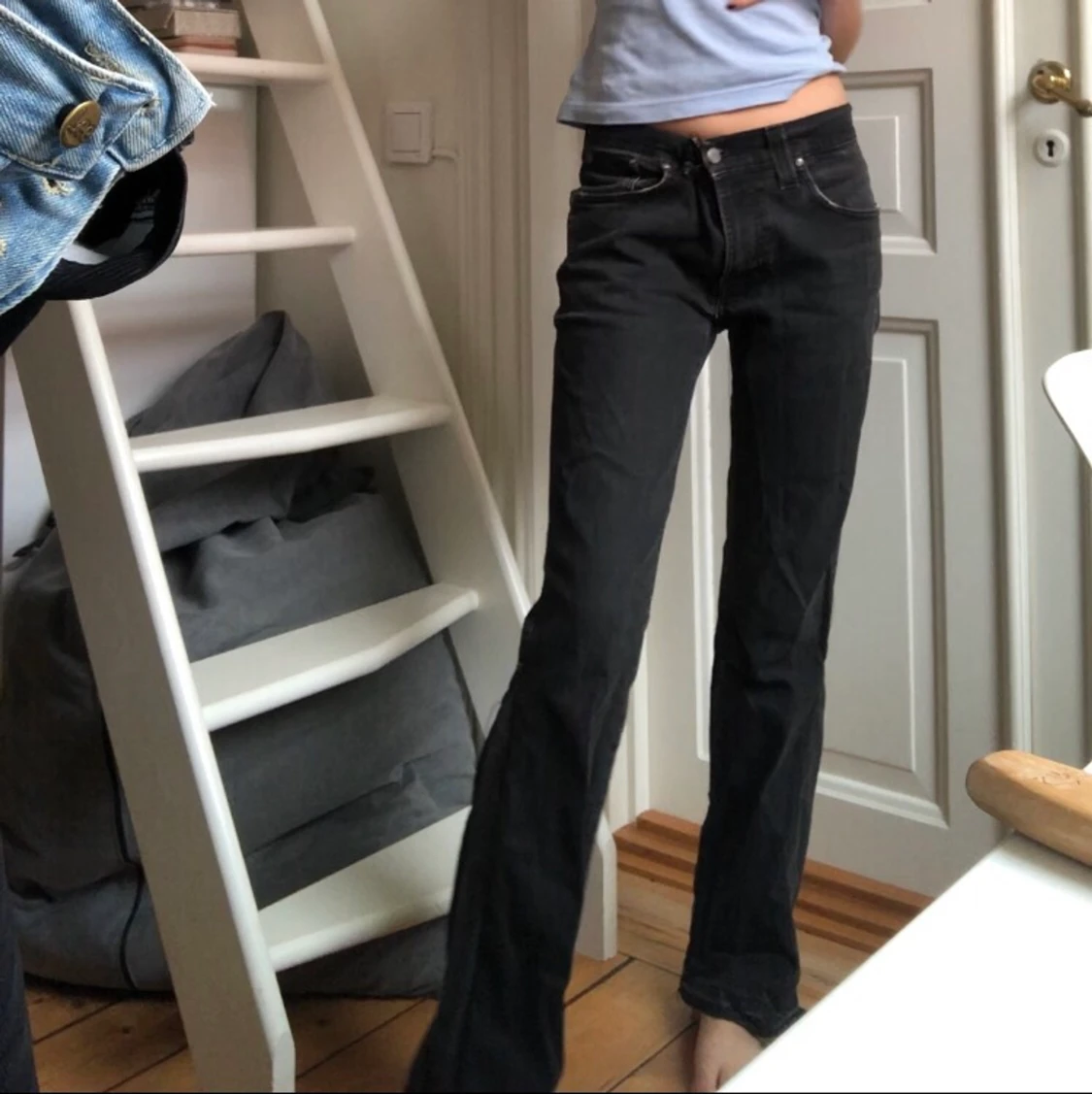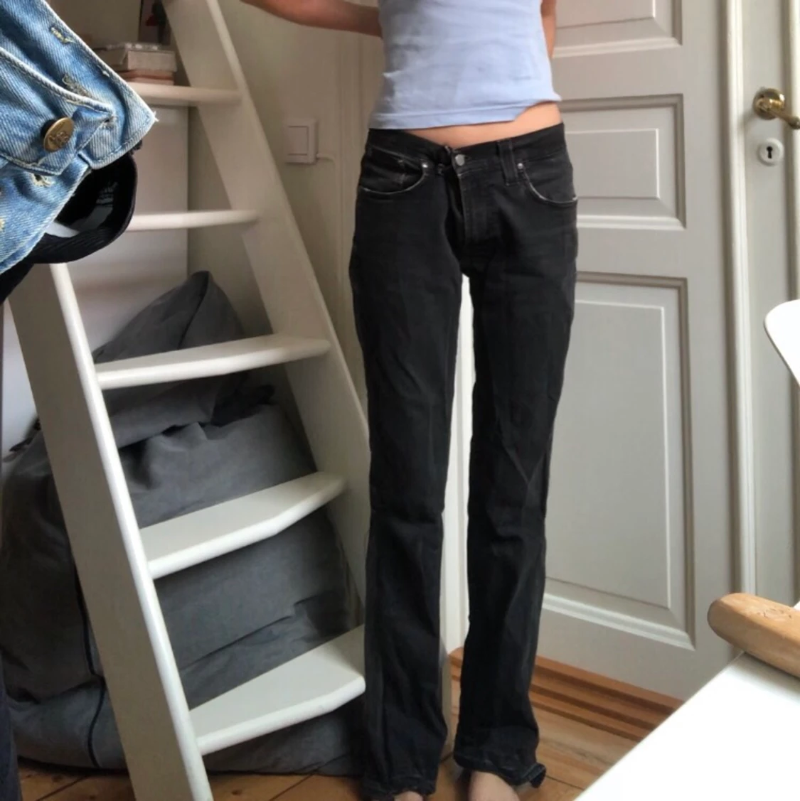 Skit coola jeans från nudie jeans, har sytt in en ”kil” med tyg i båda byxbenen för att få dom mer ”bootcut” benslutet är ojämnt vilket jag själv tycker är najs och ser lite coolt ut men går sållar o ba klippa av så att de är lika långt :) dom är väldigt sköna!!! Storleken är väldigt oklar jag själv är typ en xs kan skicka mått!