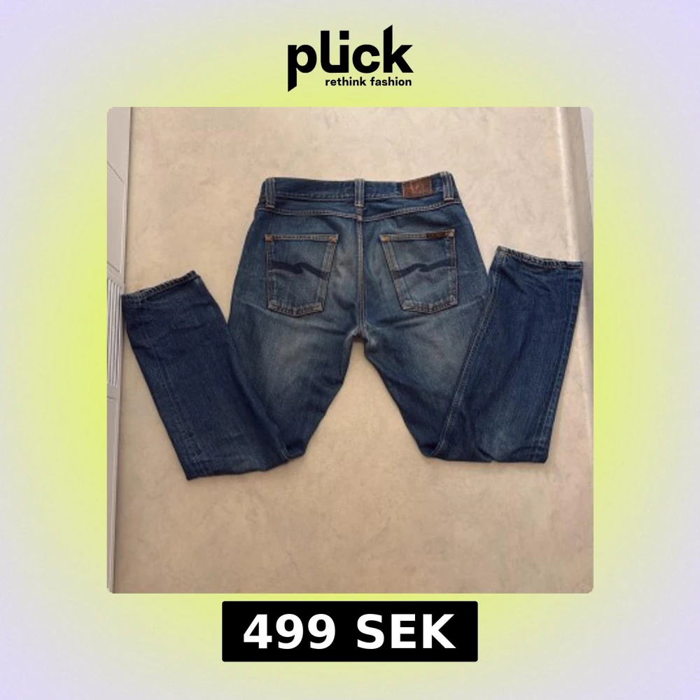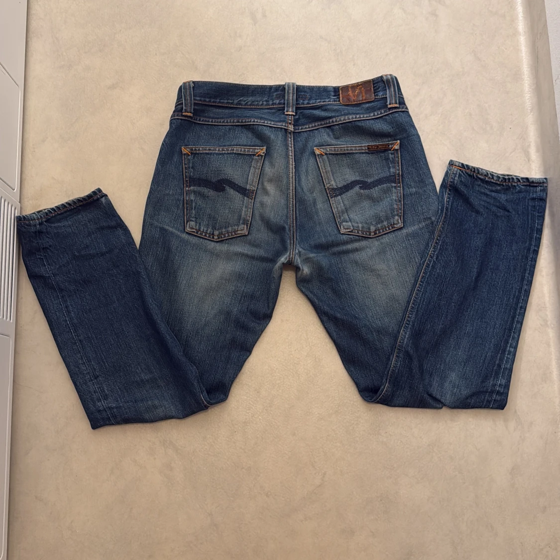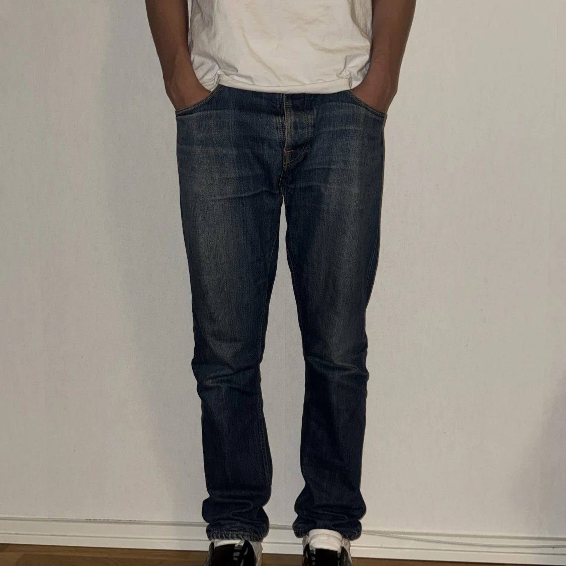 Säljer ett par marinblå jeans från Nudie Jeans. Modell är 178cm och väger 65kg. Skick 8/10. Pris kan diskuteras🙏
