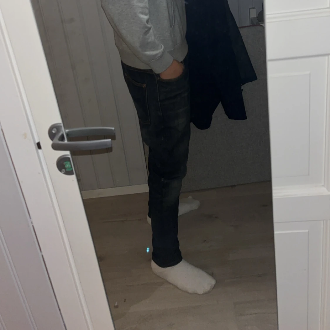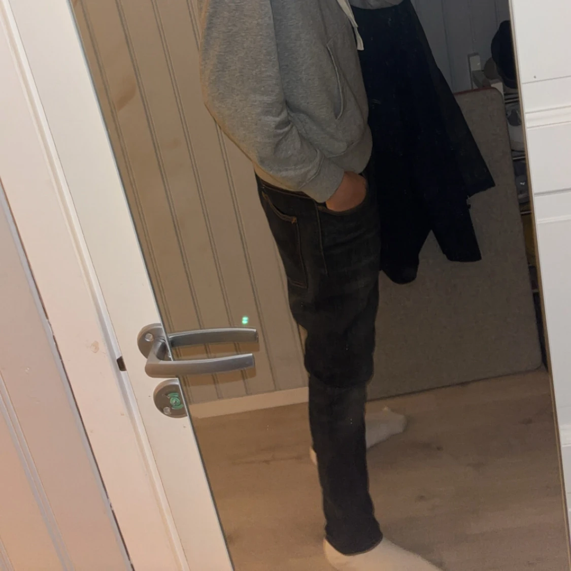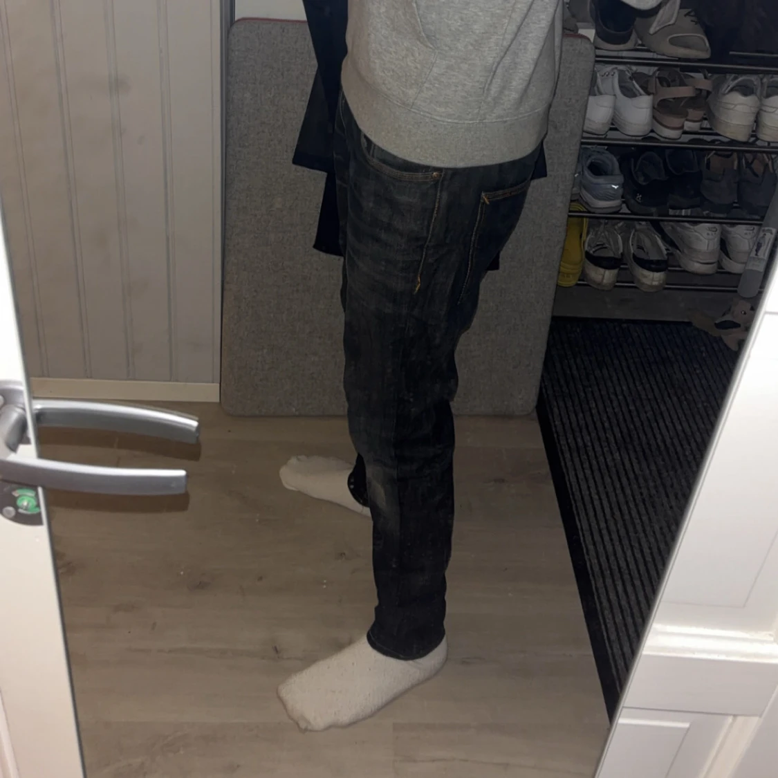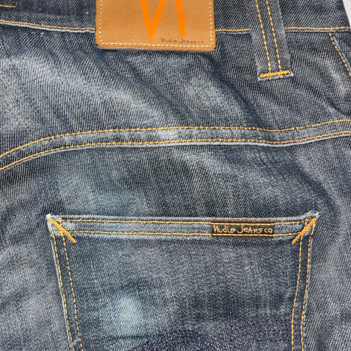 Säljer ett par Nudie jeans W32 L32 har ett litet hål i ena fickan. Dom är en mix mellan typ svart o grå