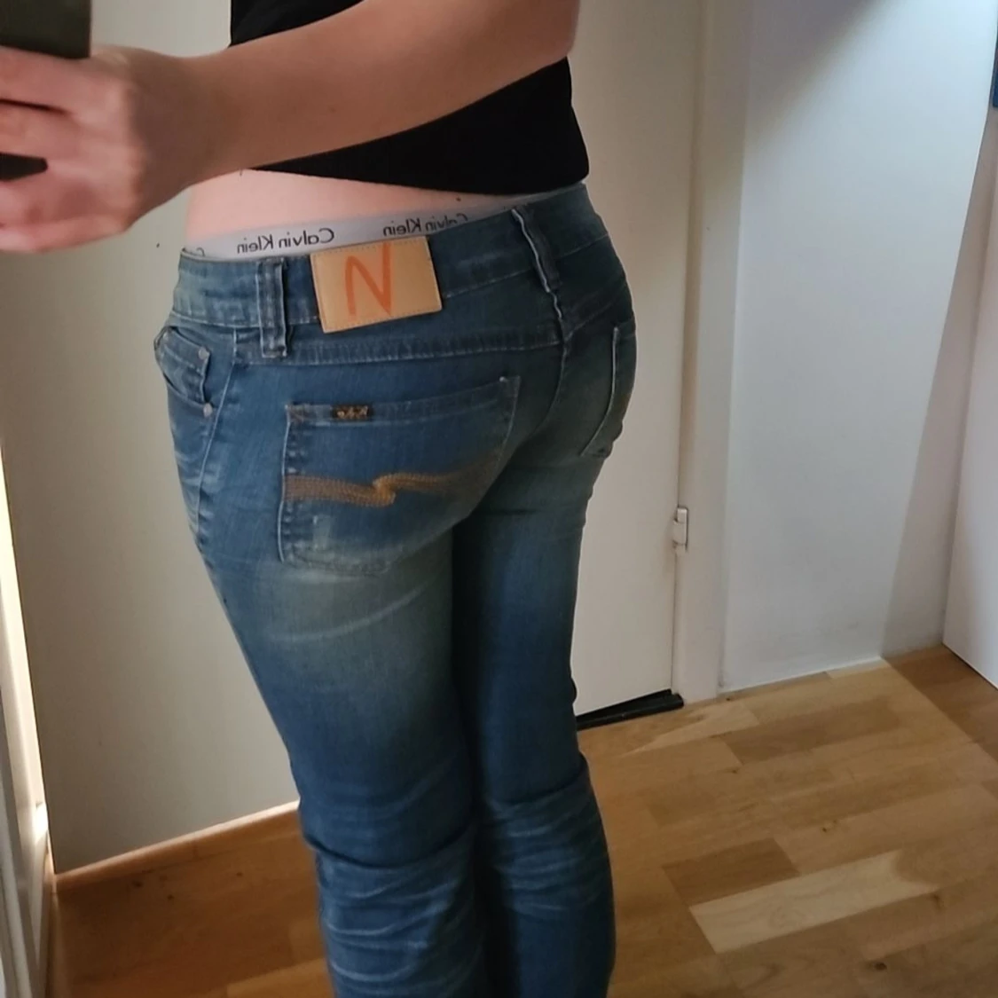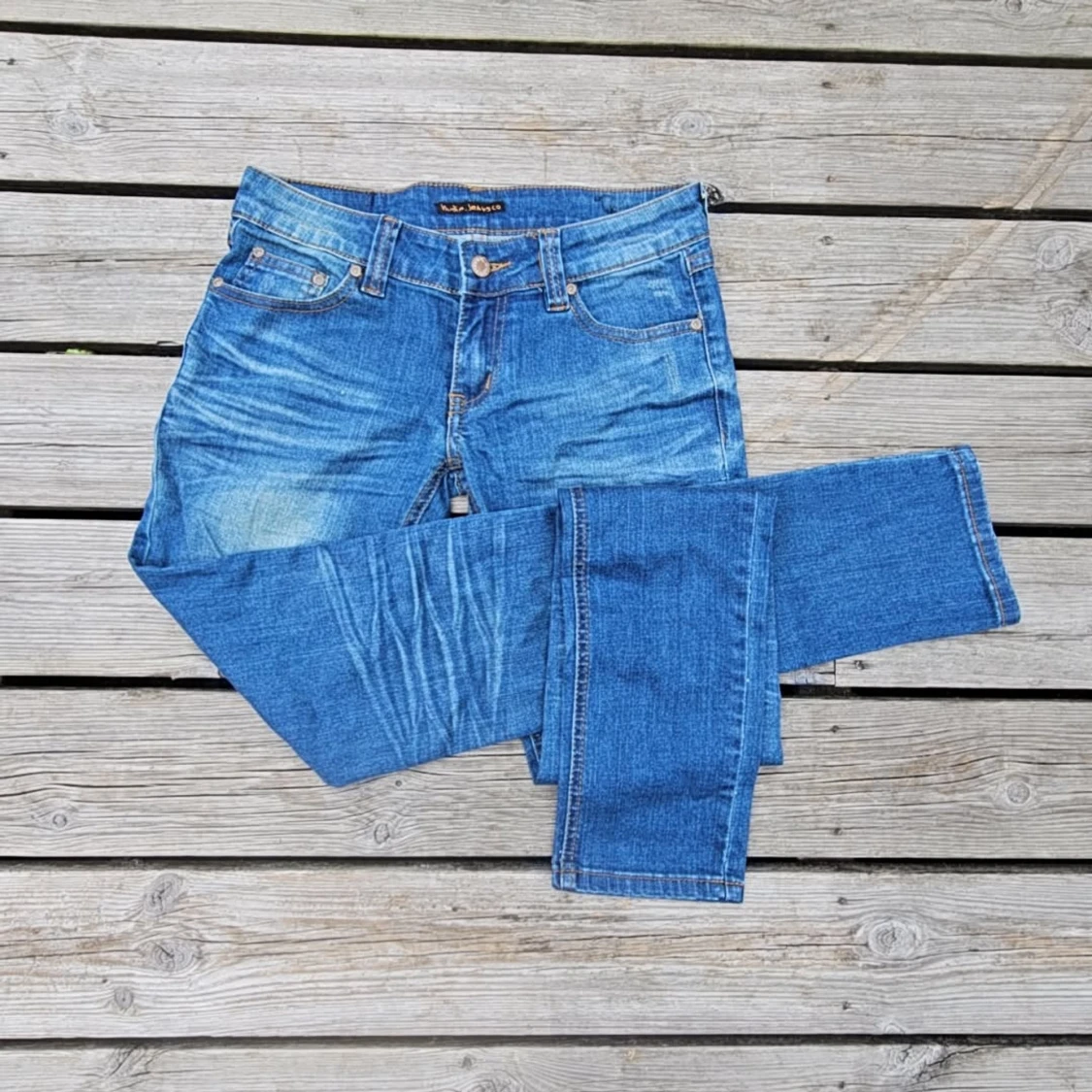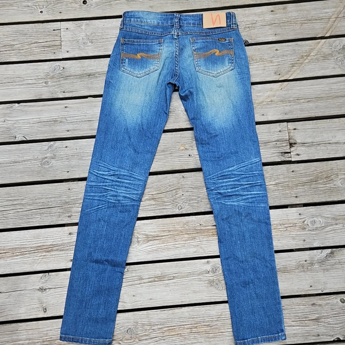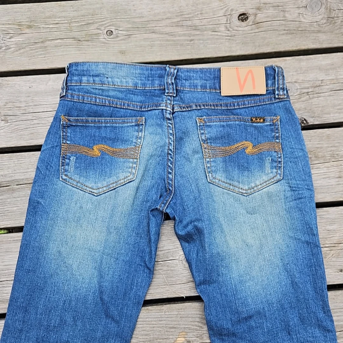 Superfina lågmidjade Nudie jeans i blå denim med blekning, storlek 26. Knappt använda, i mycket fint skick. Midja: ca 77–78 cm innerbenslängd: ca 80 cm