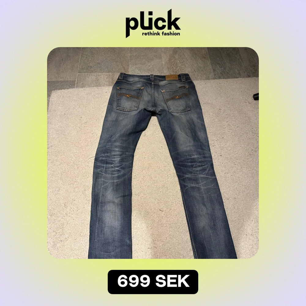 Säljer ett par snygga blå nudie jeans med coola slitningar på knäna. De har en klassisk femficksdesign och en bekväm passform. Perfekta för en avslappnad stil och kan matchas med nästan vad som helst. Dem har ett litet hål i ena fram fickan och passar mig som ör 185 ungefär