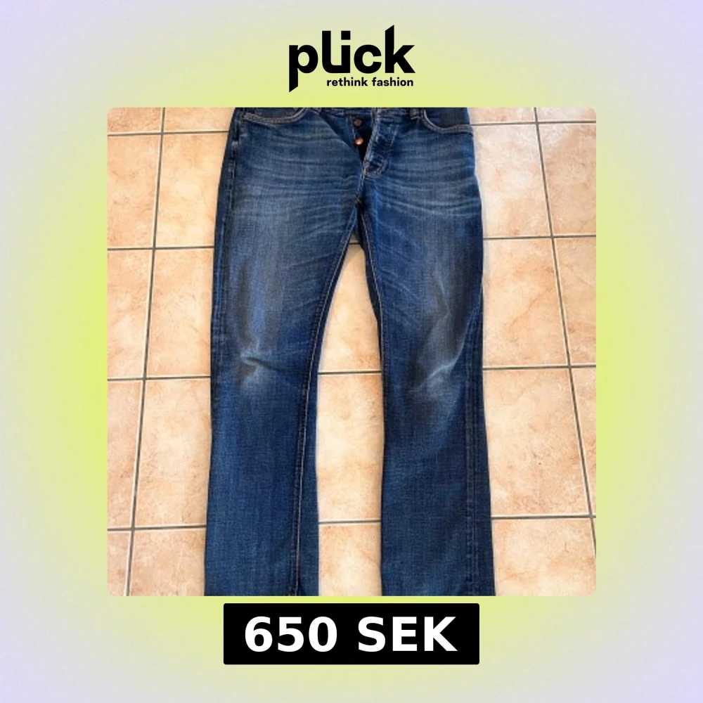Säljer ett par klassiska blå jeans från Nudie Jeans med snyggt slitna detaljer och kontrastsömmar. Jeansen har raka ben, fem fickor och läderpatch med logga bak. Perfekta för dig som gillar en tidlös och avslappnad stil. Väldigt litet hål vid bakre fickorna men det syns inte. L 32