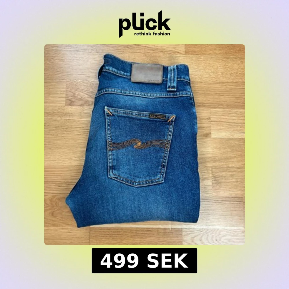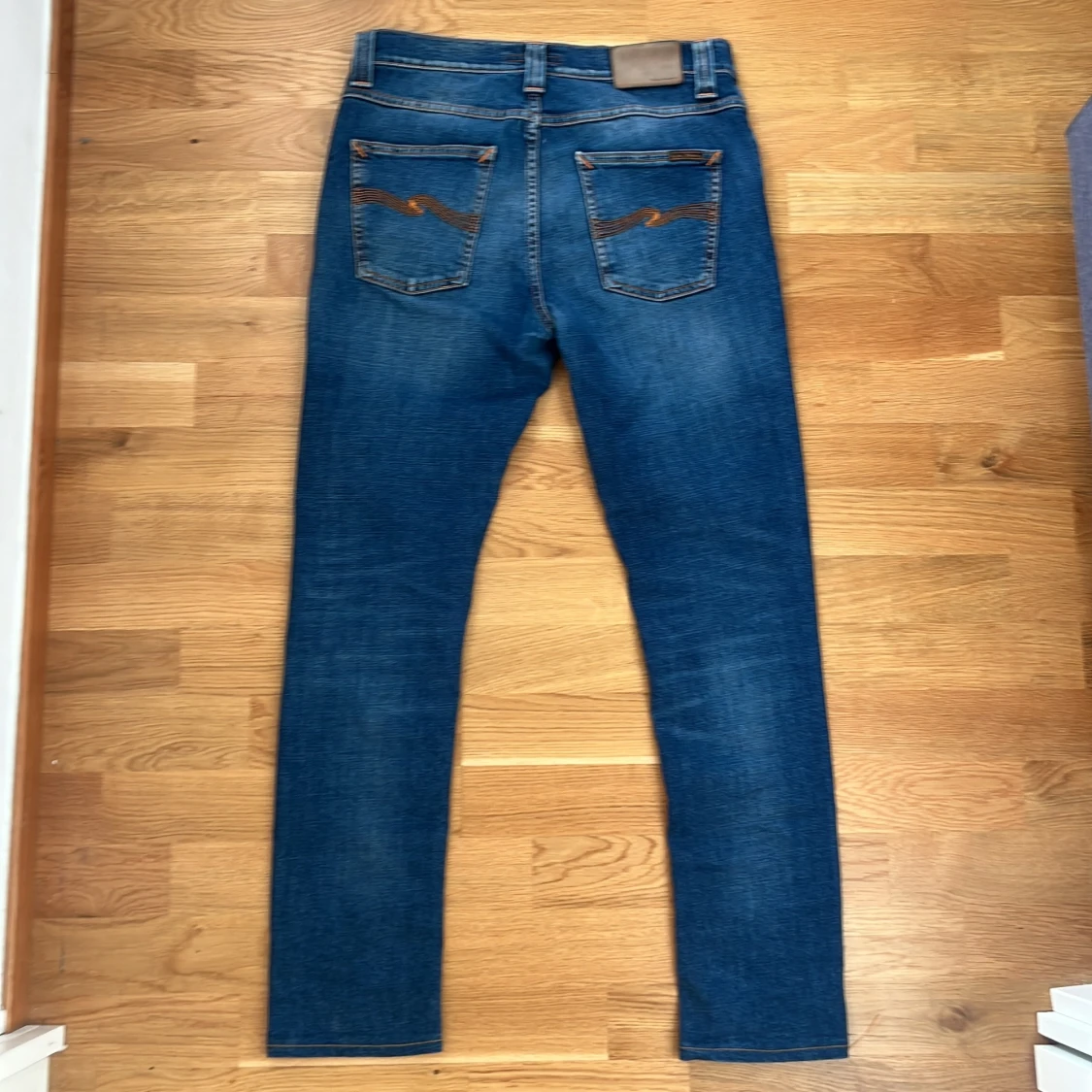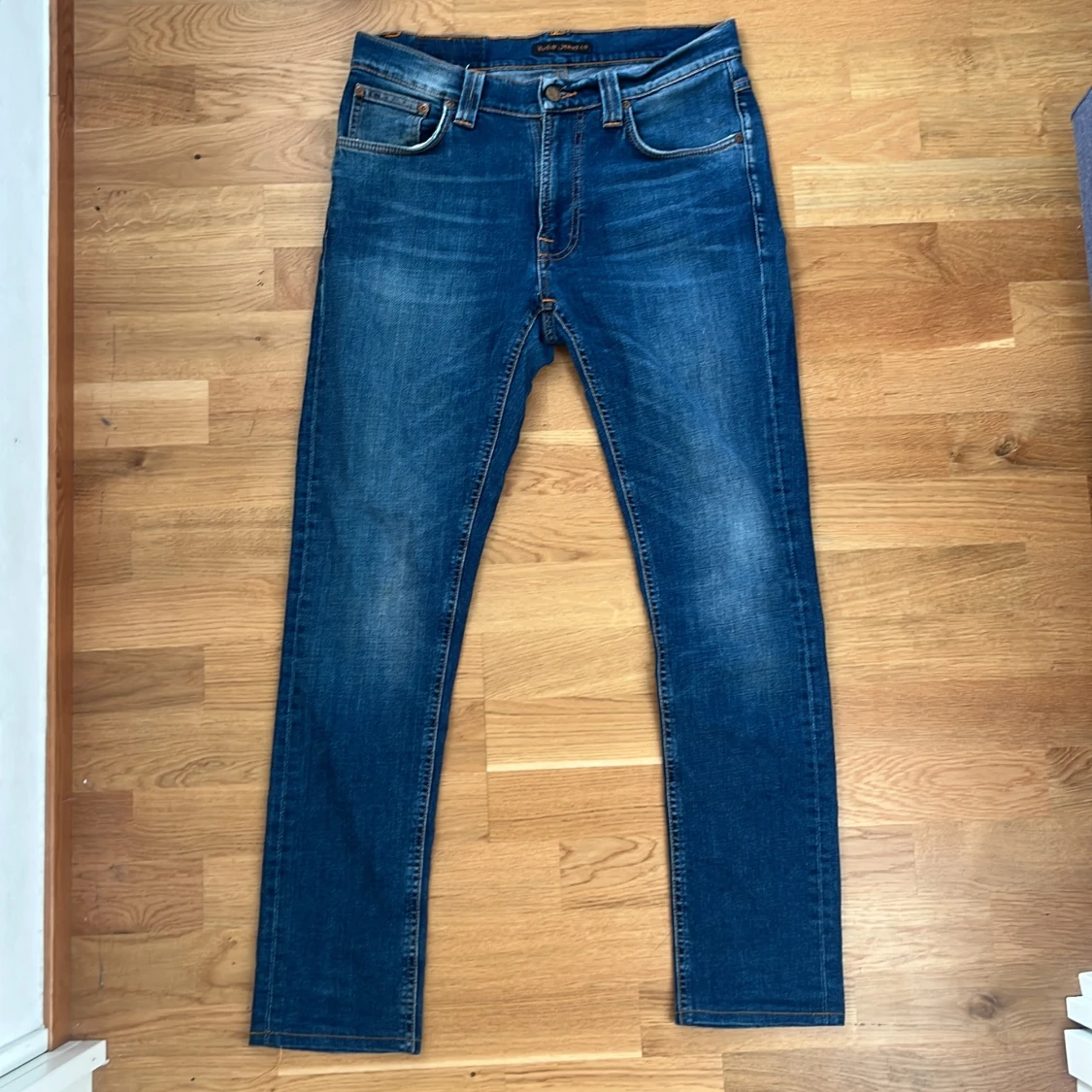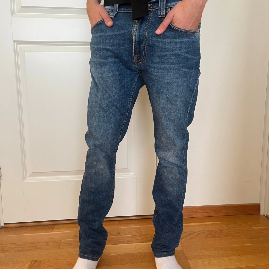 Säljer ett par klassiska blå jeans från Nudie Jeans med snyggt slitna detaljer och orange sömmar på bakfickorna. Modellen är slim fit med normal midja och raka ben. Jeansen är tillverkade i mjuk bomull med en skön stretch för extra komfort.