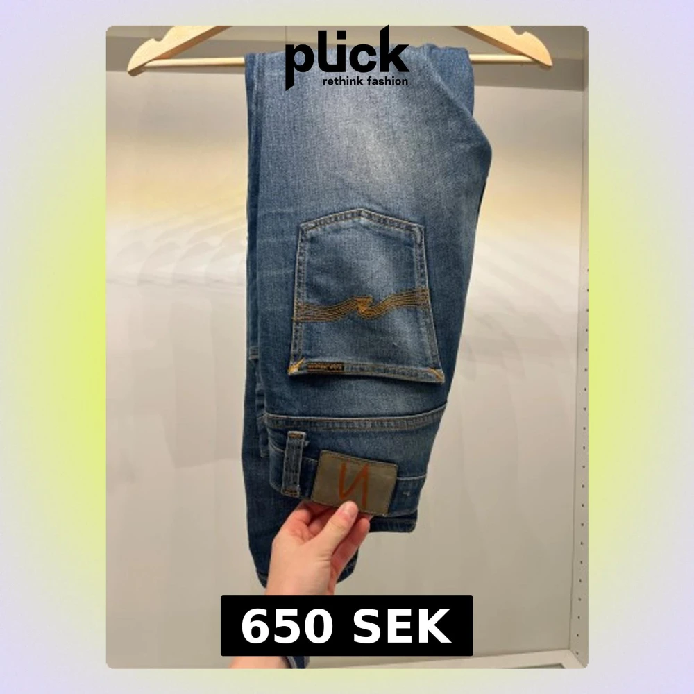Snygga blå jeans från Nudie Jeans i modellen skinny med klassisk orange söm på bakfickan. Jeansen har normal passform, fem fickor och är tillverkade i mjukt jeanstyg. Perfekt för dig som gillar en smal siluett och stilren look. Jag är 167 och sitter förstort