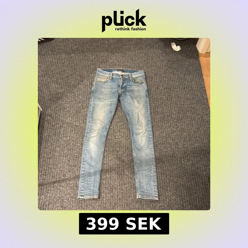 Säljer ett par ljusblå jeans från Nudie Jeans i storlek 29/30. Jeansen har klassisk femficksdesign, snygga slitningar och kontrastsömmar. Materialet är mjukt . Perfekt för dig som gillar en cool tvätt. Skick skulle säga 8/10 pris 299