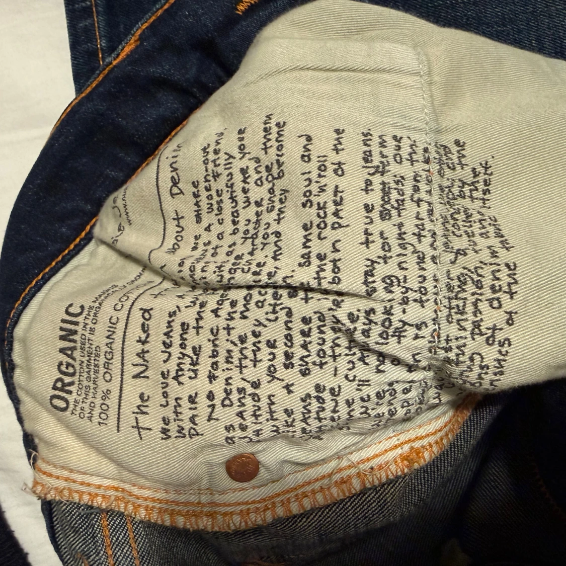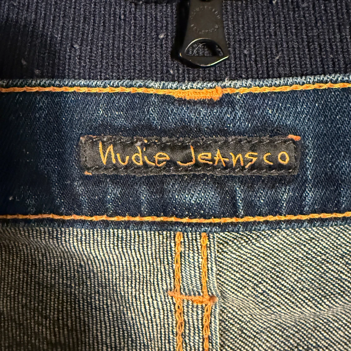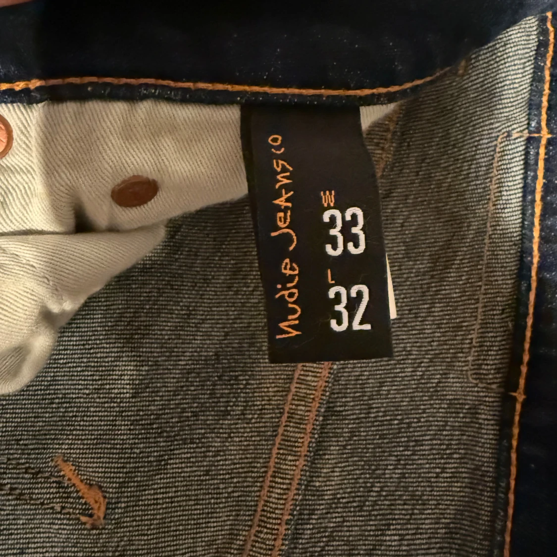 Säljer ett par klassiska blå jeans från Nudie Jeans Co i storlek 33/32. Jeansen har snygga slitningar, orange kontrastsömmar och ikoniska bakfickor med vågig brodyr. Tillverkade i bomull med knappgylf och normal passform. Perfekta för en avslappnad streetstil. Hör av er vid frågor!