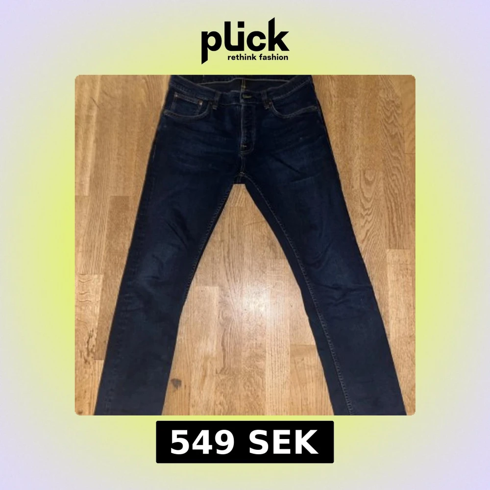 Snygga mörkblå Nudie Jeans Grim Tim i storlek 34/34. Klassisk femficksmodell med orangea sömmar och raka ben. Materialet är 99% bomull och 1% elastan för lite stretch. Perfekt passform och stilren look. , OBS!! (Lite slitagehål på baksida ben)