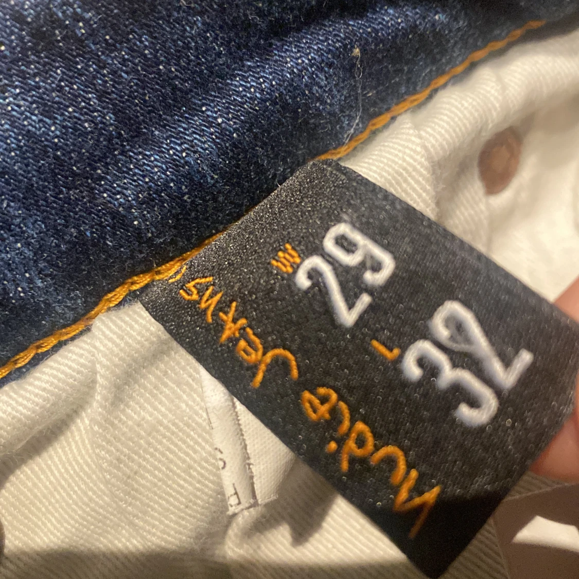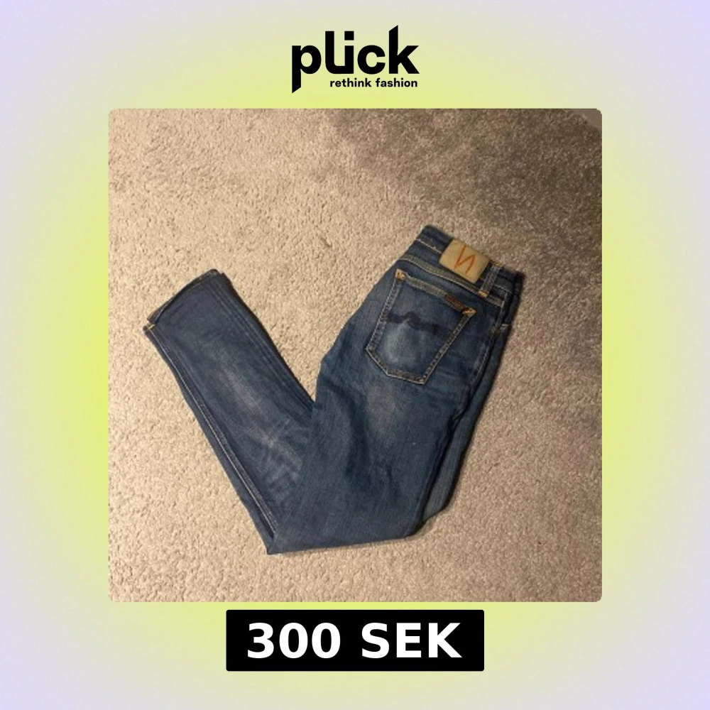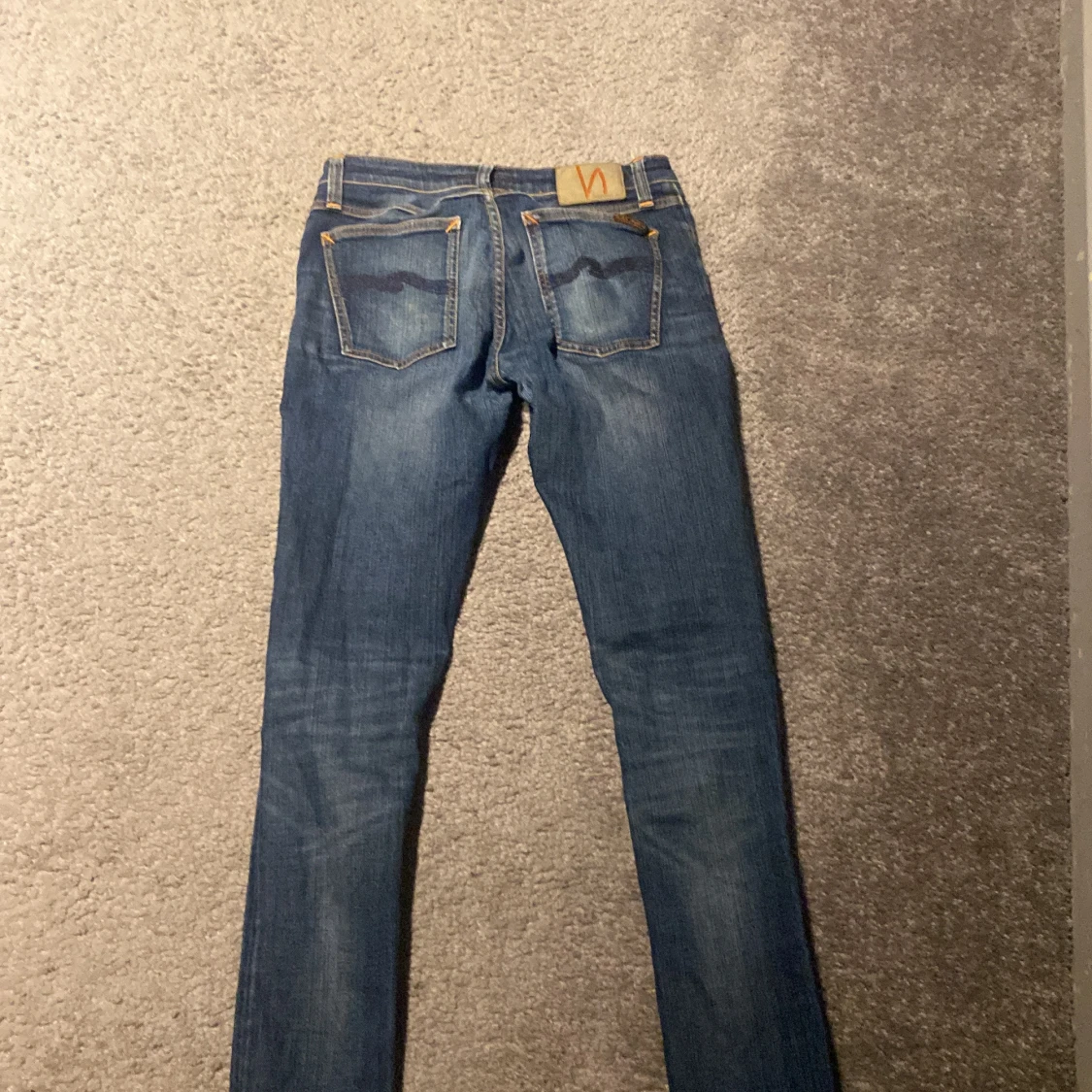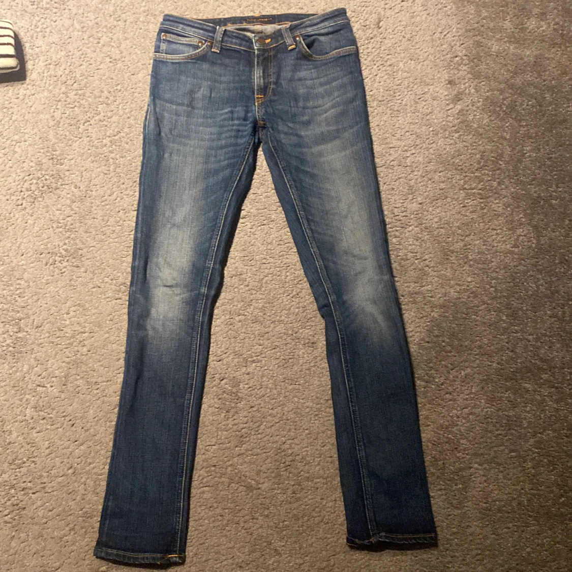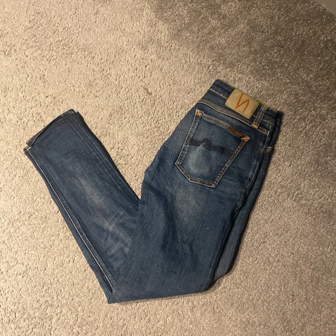 Snygga blå jeans från Nudie Jeans med klassisk femficksdesign och orange sömmar. Jeansen har en smal passform och är perfekta för en avslappnad stil. Märkeslogga på bakfickan ger en extra touch.