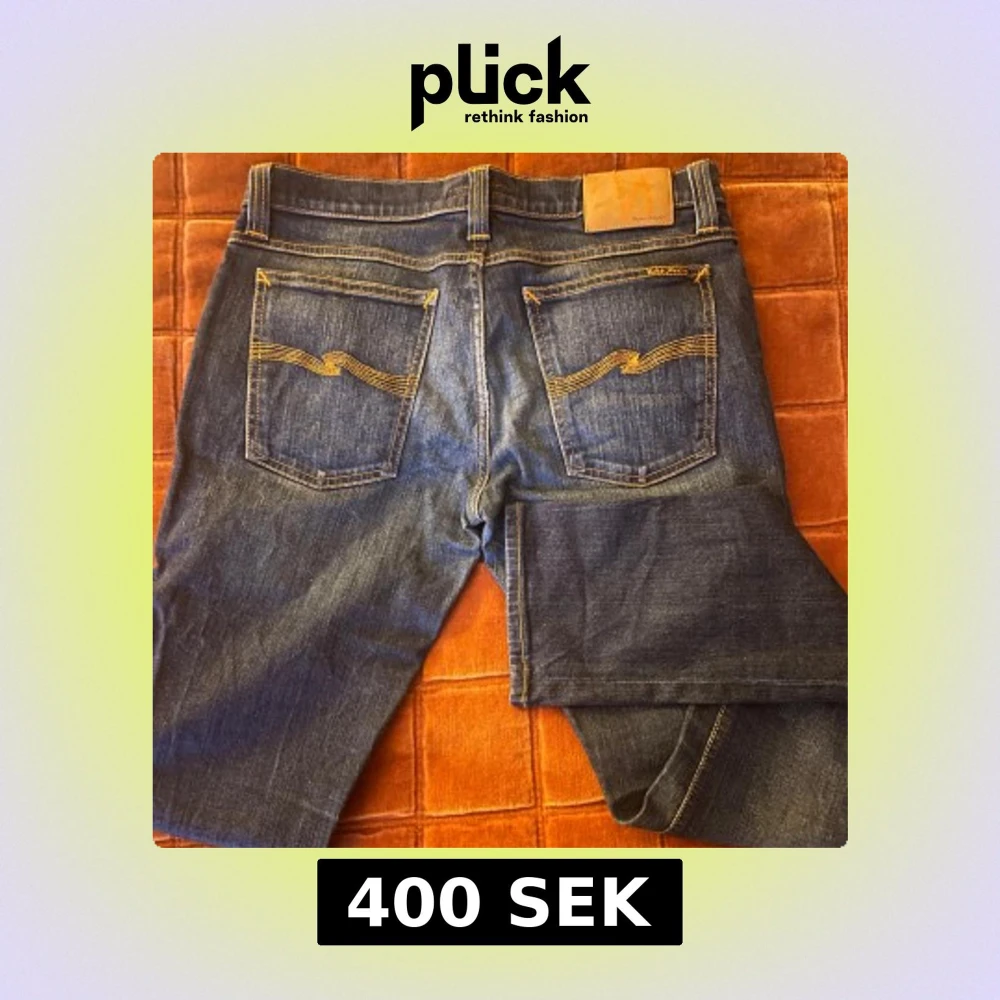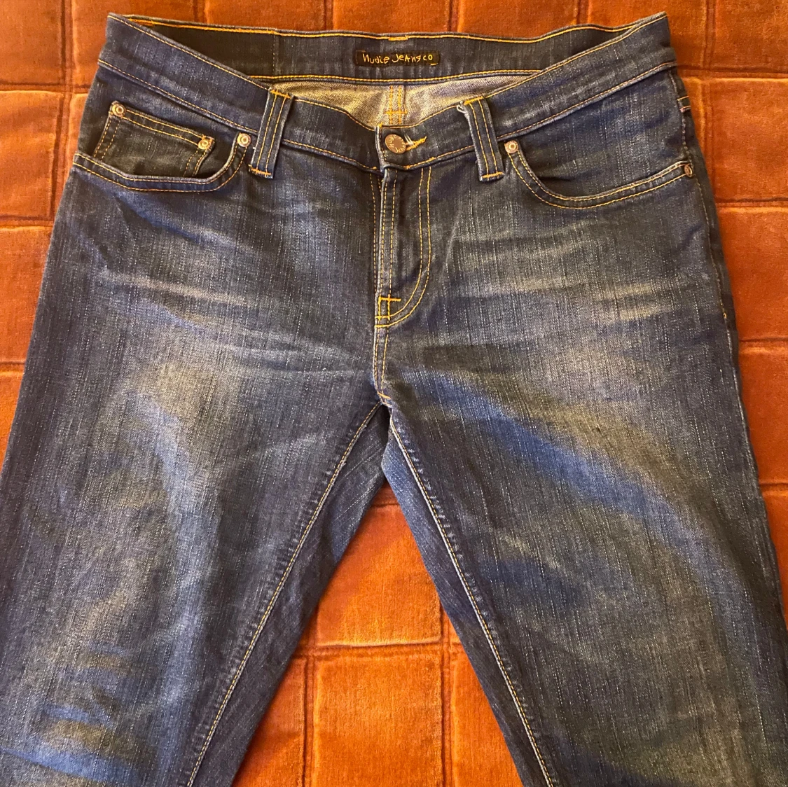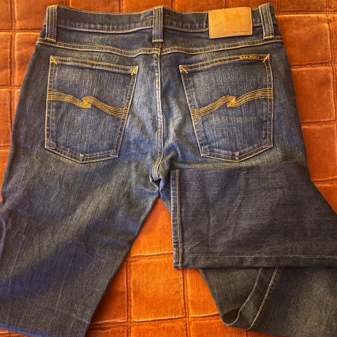 Säljer ett par mörkblå jeans från Nudie Jeans med klassisk femficksdesign och snygga kontrastsömmar. Jeansen har raka ben och normal passform, med Nudie-loggan broderad på bakfickorna. Tillverkade i slitstarkt denim av bomull.