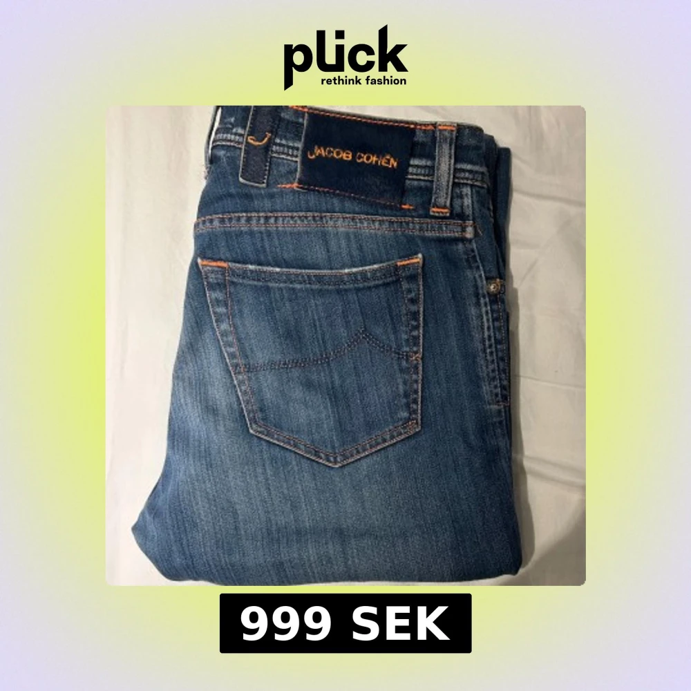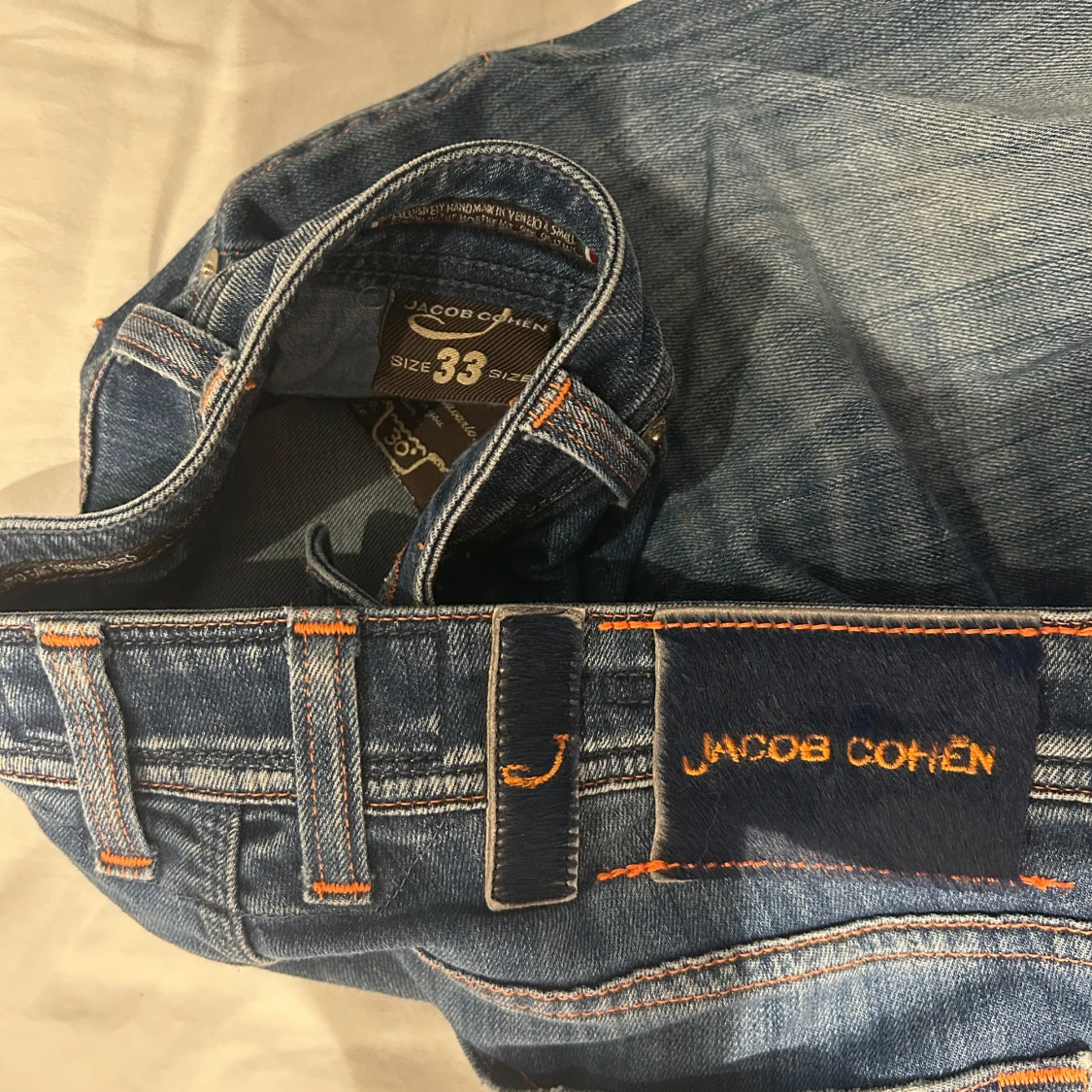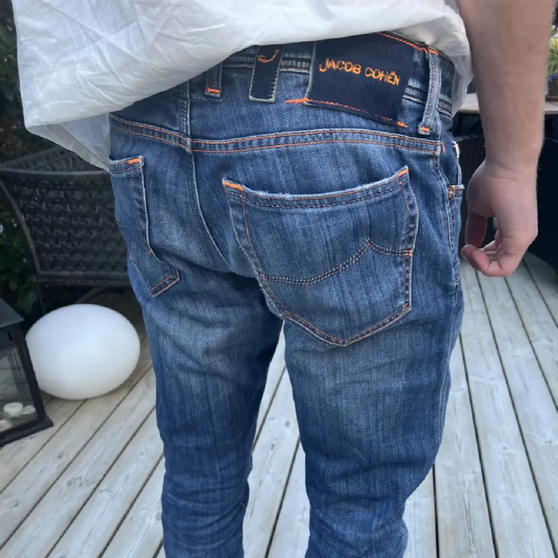 Snygga blå jeans från Jacob Cohën med orange kontrastsömmar. Jeansen är slim fit och i mycket bra skick. Nypris ligger på 3500, säljer nu för endast 999.