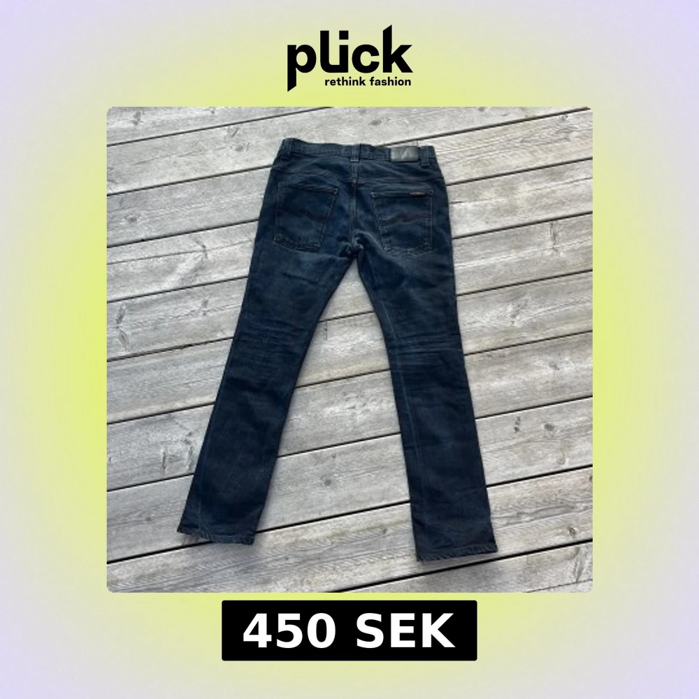 Riktigt snygga Nudie Jeans i mörkblå! Skick 9/10, knappt spår av användning förutom ytterst lite på läderlappen. Storleken är 32/32 och modell syns på bild. Hör av er vid frågor eller funderingar 🙏
