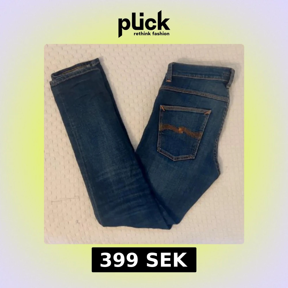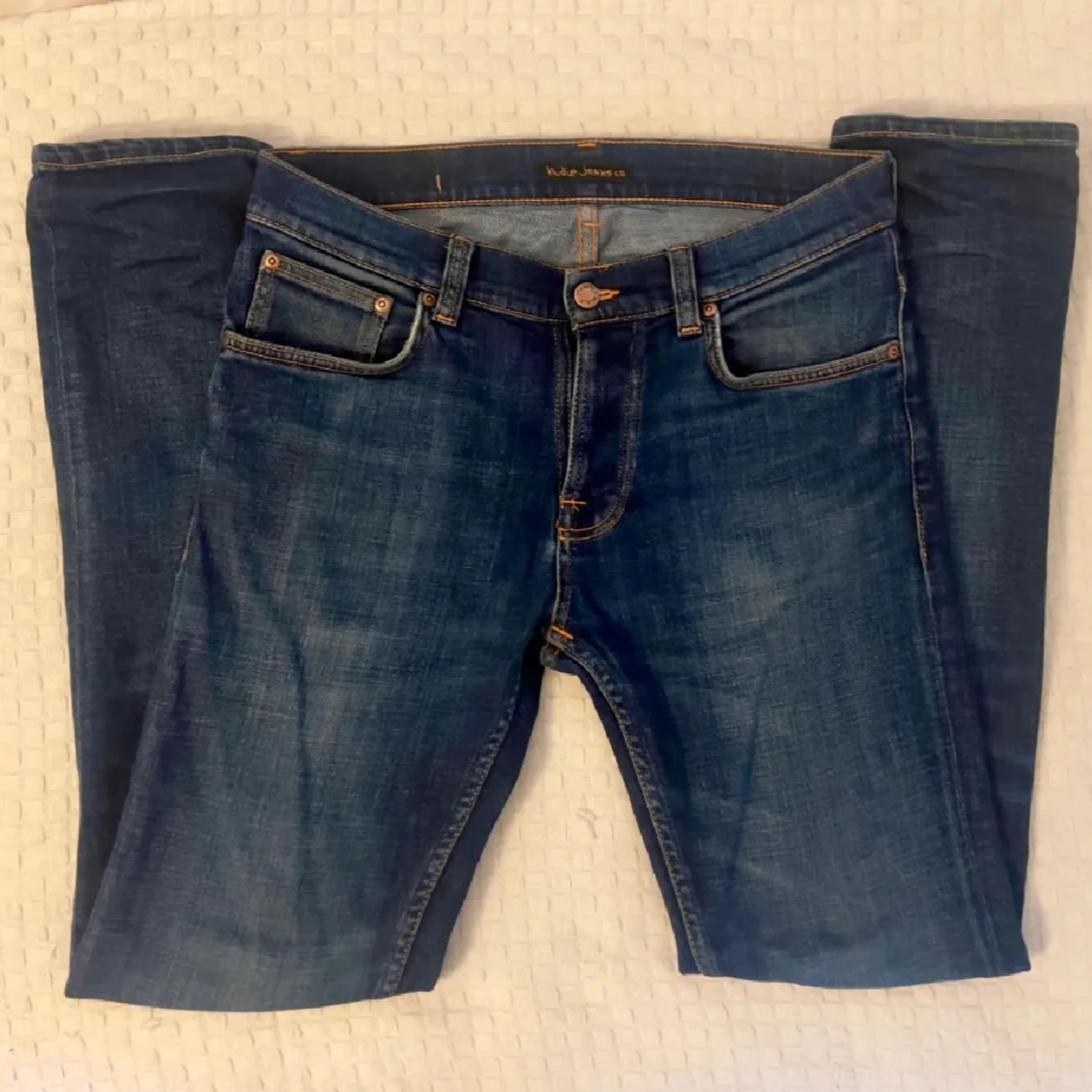 Säljer ett par klassiska blå jeans från Nudie Jeans med orange sömmar och fem fickor. Jeansen har en rak passform och är tillverkade i slitstarkt denim. Perfekta till vardags och passar till det mesta. Bara att höra av sig om men är intresserad eller har frågor!