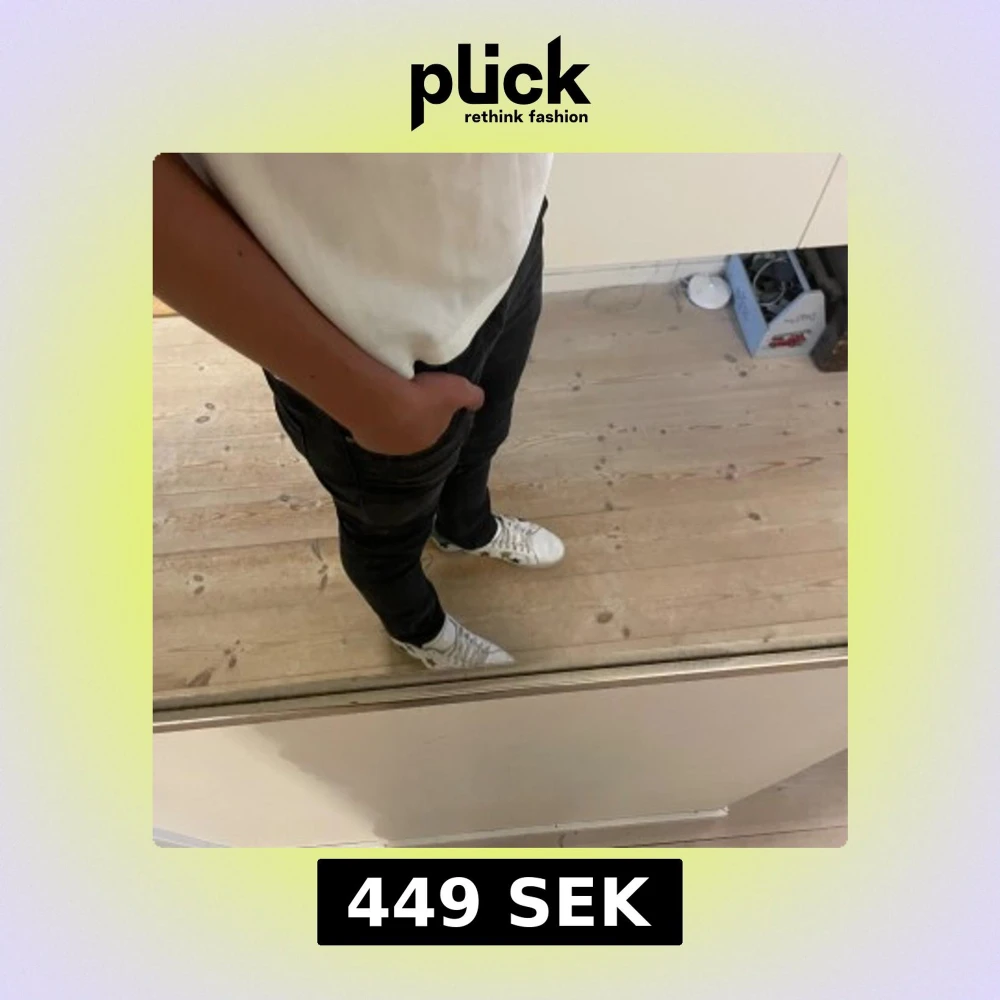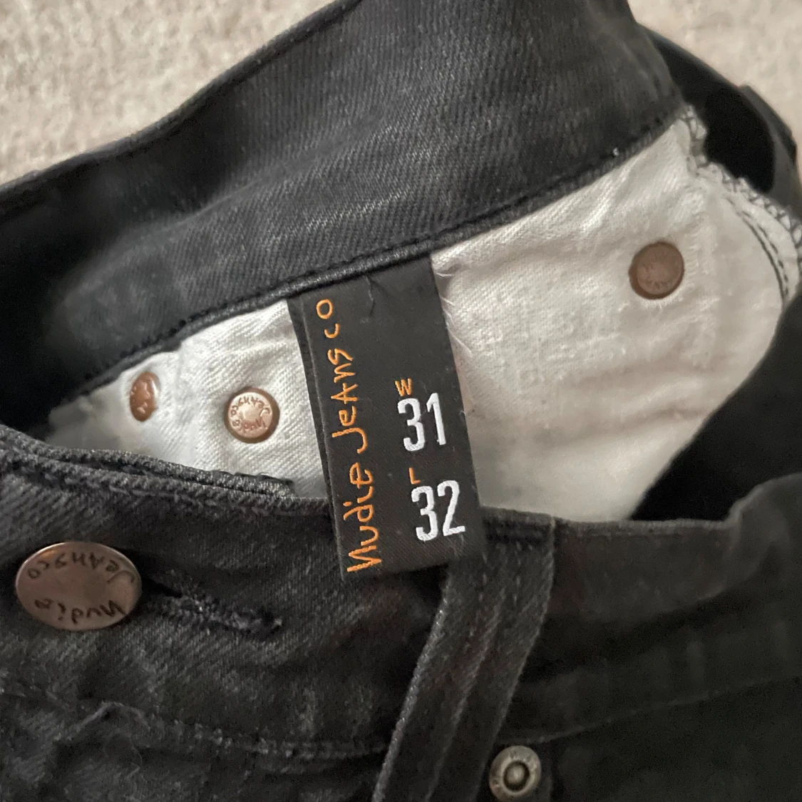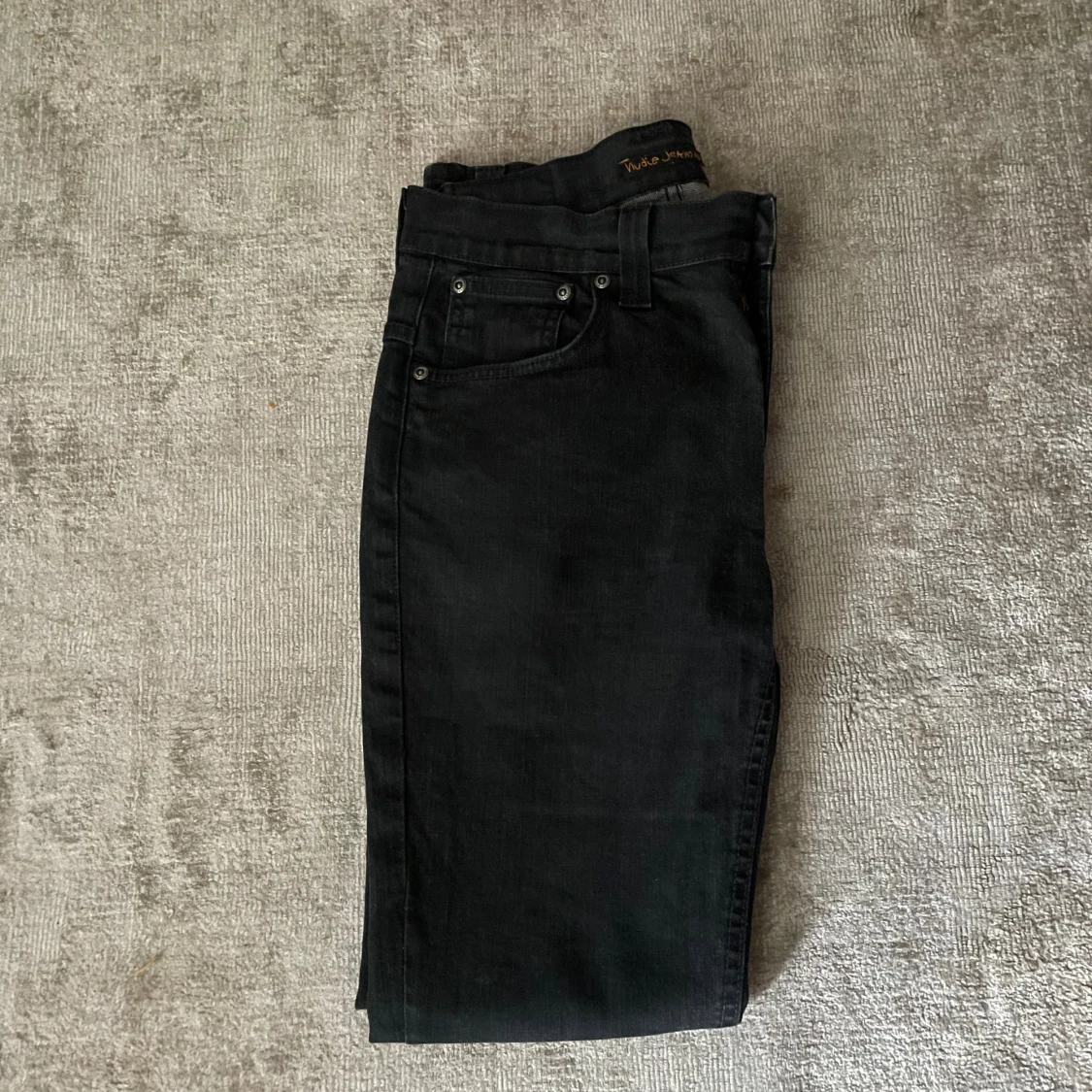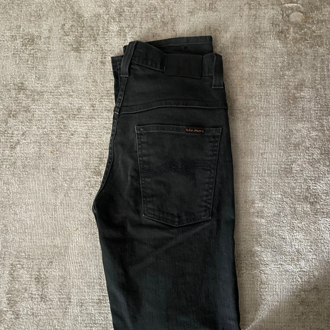 Hej! Säljer ett par svarta jeans från Nudie Jeans i storlek 31/32. De har klassisk femficksdesign, raka ben och snyggt diskret broderi på bakfickan. Jeansen är i stretchig bomull och sitter riktigt snyggt med en slim passform.