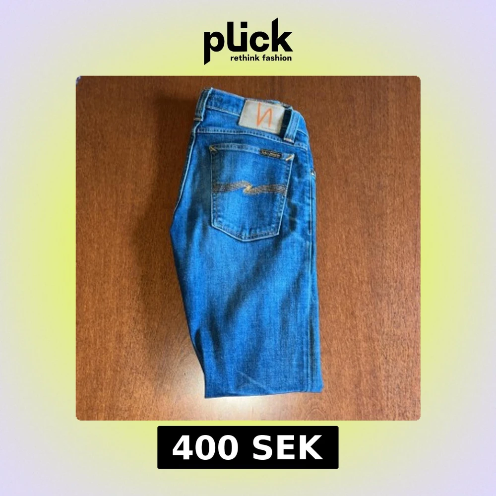 Säljer ett par klassiska blå jeans från Nudie Jeans med orange sömmar och broderad bakficka. Jeansen har normal passform. Perfekta för dig som gillar stilrena och tidlösa jeans. W26 men passar mig som har W29-W31 i midjan för dom är lite stretchy