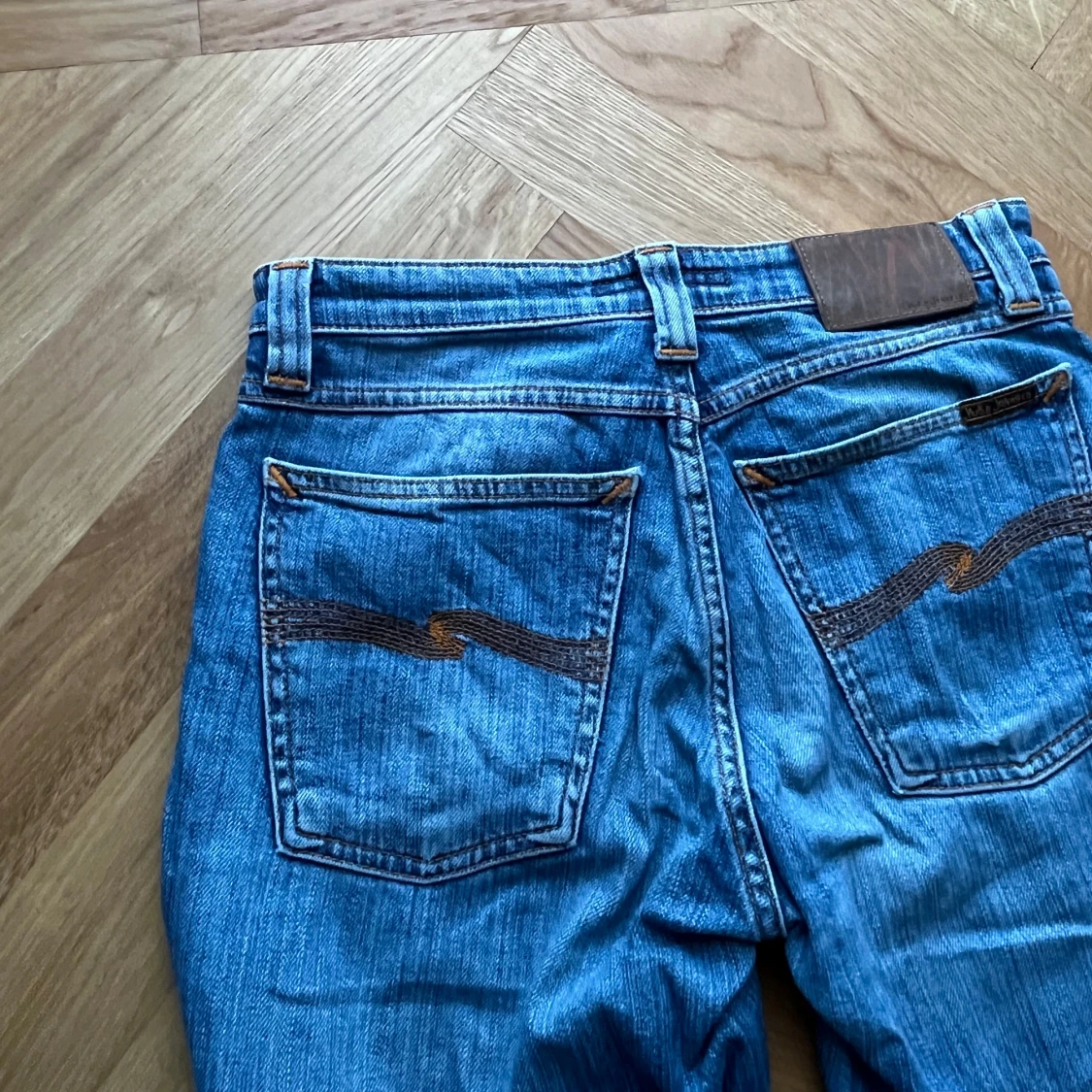 Säljer ett par klassiska blå jeans från Nudie Jeans med deras ikoniska broderade bakfickor. Jeansen har normal passform och raka ben, tillverkade i slitstarkt denim. Perfekta för dig som gillar tidlös stil och bra kvalitet. (Sista bilden är jeansens passform) modellen är ”Lean Dean”) 🔥🙌 w.29 har tyvvär ingen bild med de på eftersom de inte passar mig men de sitter som byxorna på bild 3!🙌