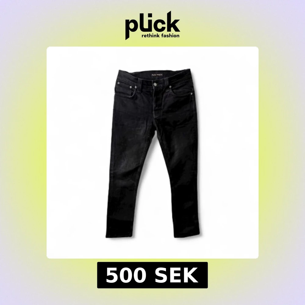 Svarta jeans från Nudie Jeans med klassisk femficksdesign och diskret logga på bakfickan. Modellen är Grim Tim.