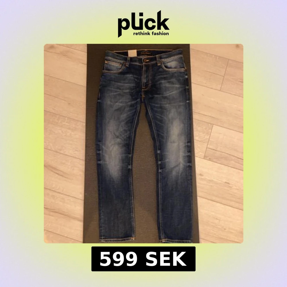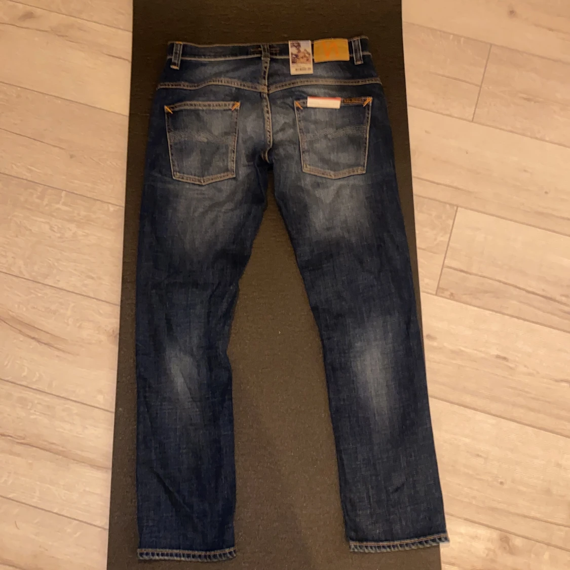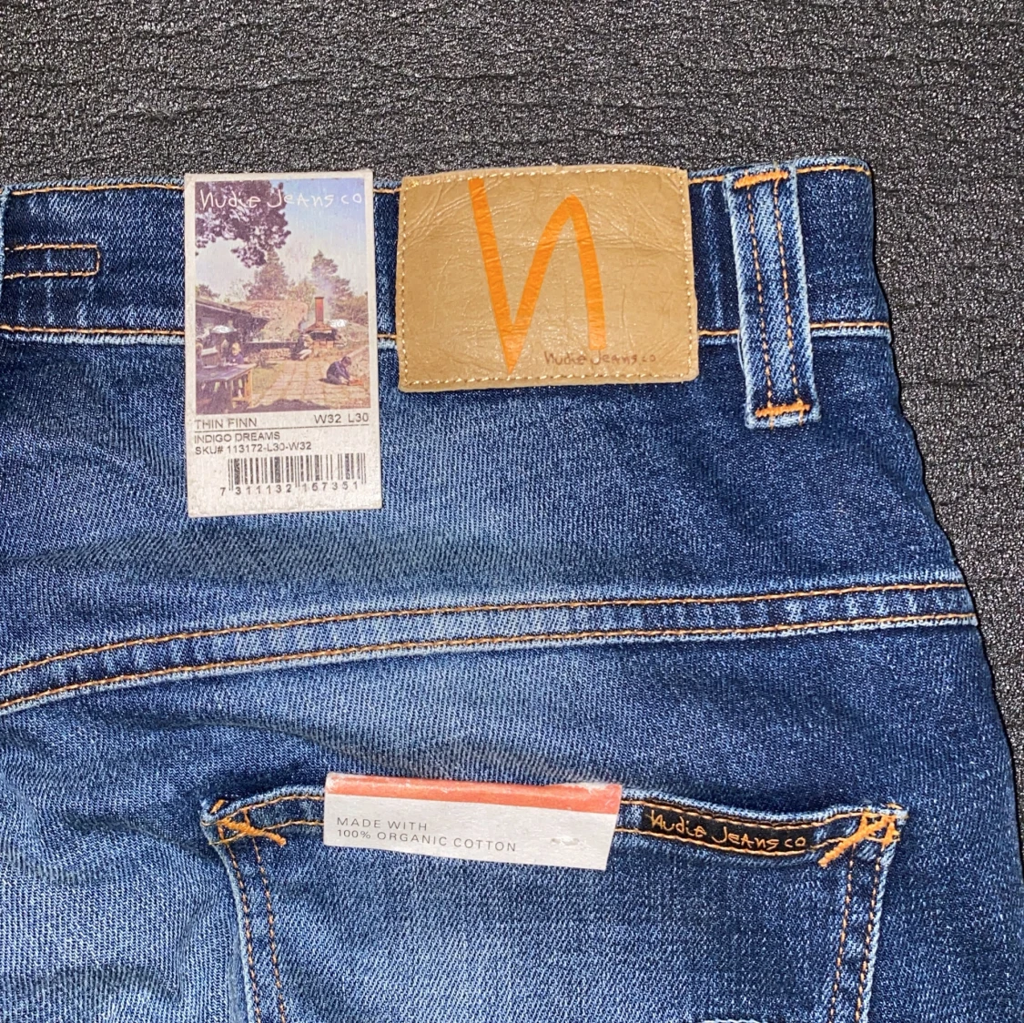 Snygga blå jeans från Nudie Jeans, modell Thin Finn Indigo Dreams. Jeansen har en smal passform, klassisk femficksdesign och är tillverkade av 100% ekologisk bomull. Färgen är mörkblå med slitningar och kontrastsömmar. Perfekta för en avslappnad och trendig look. Näst intill sprillans nya, delar av tags kvar.