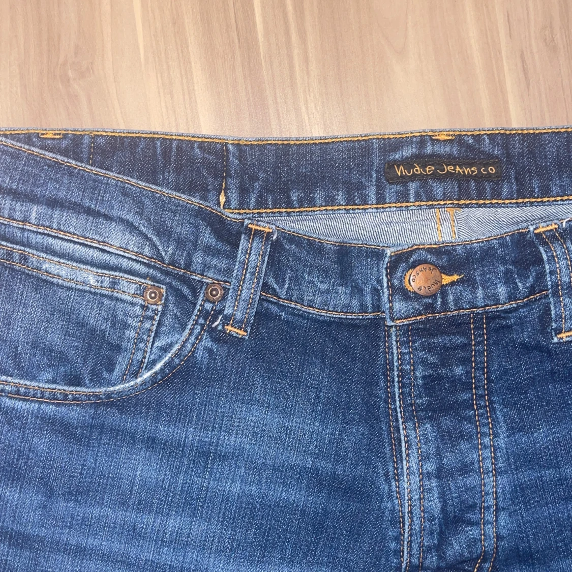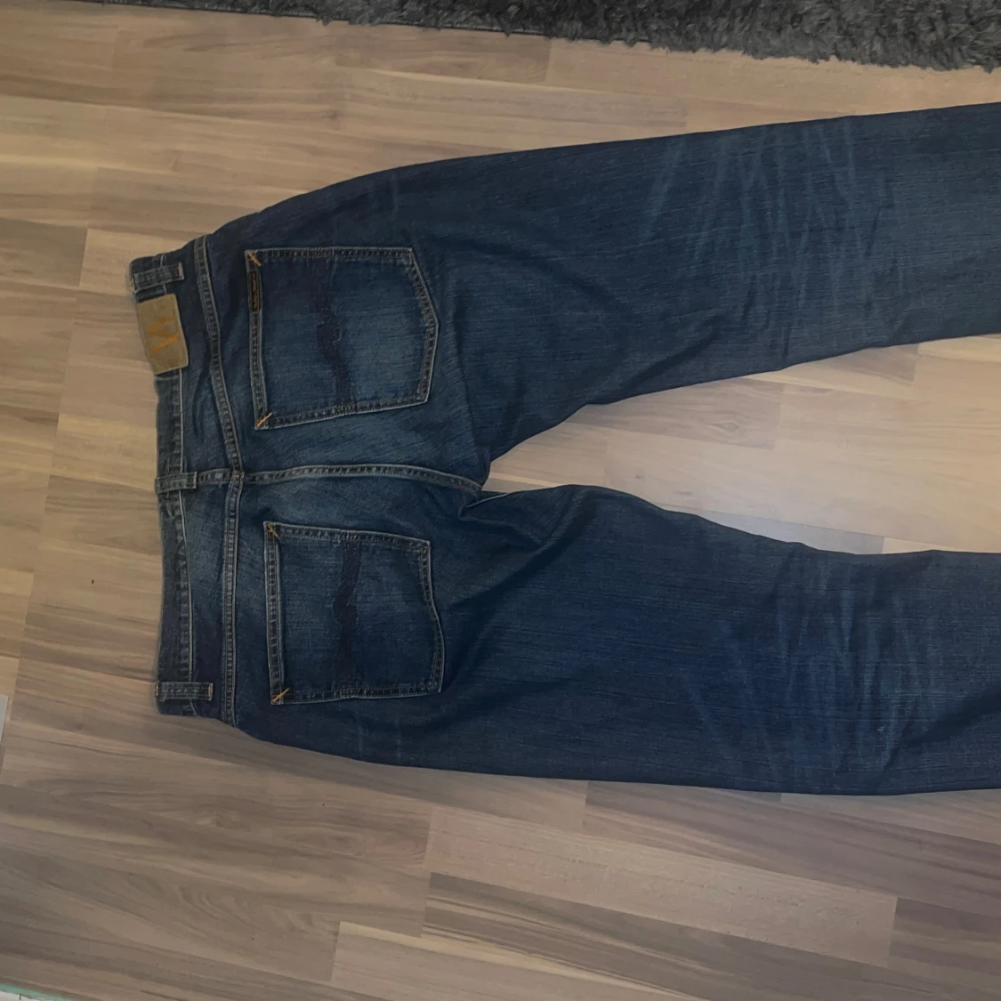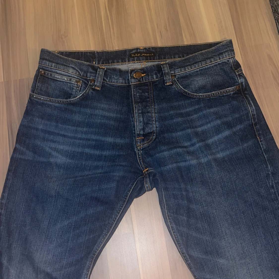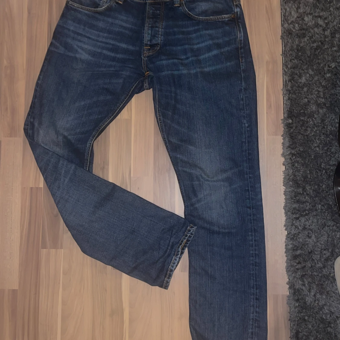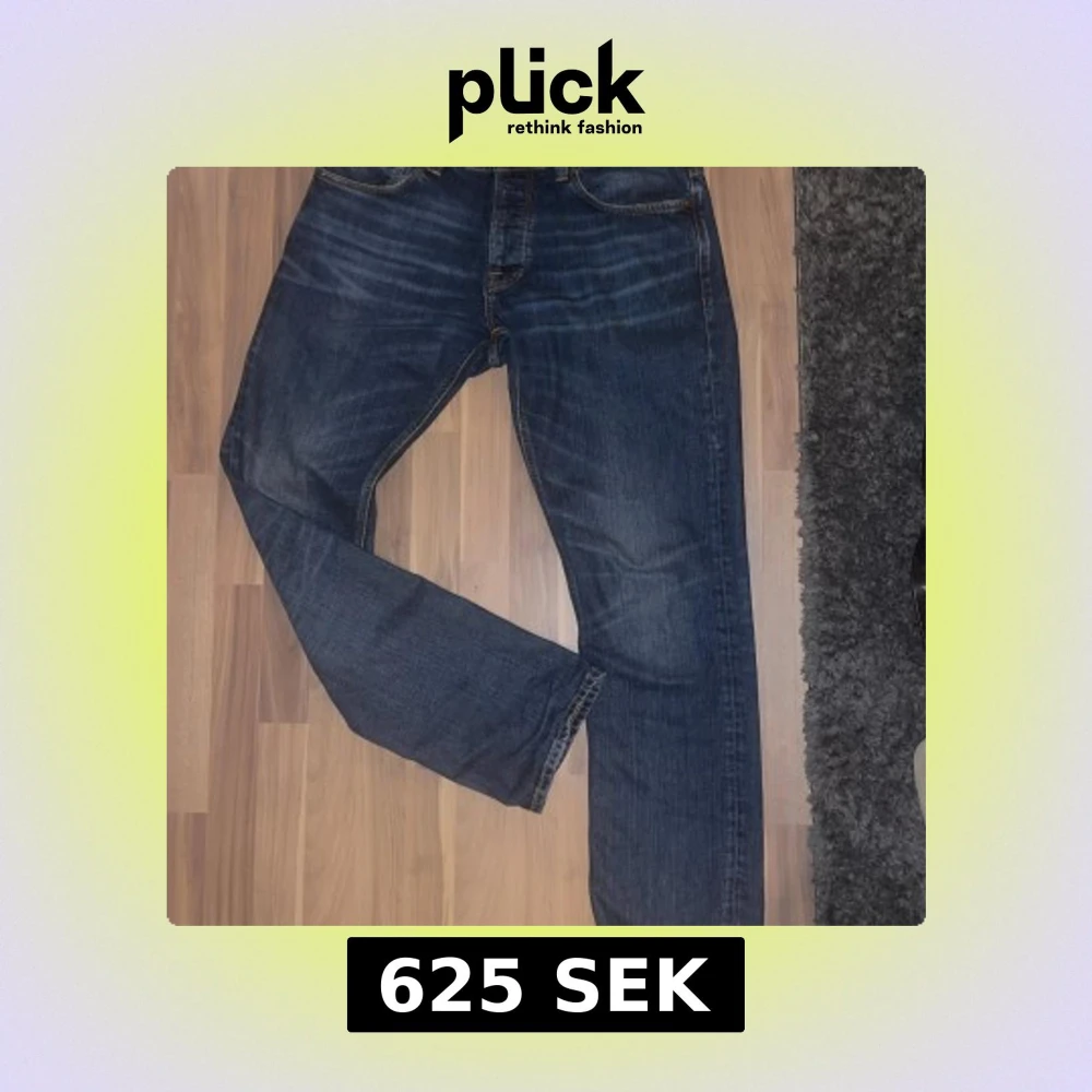 Säljer ett par klassiska jeans från Nudie Jeans. De har en normal passform med fem fickor och knappgylf. Straight fit, strl 34/34. Inga defekter!