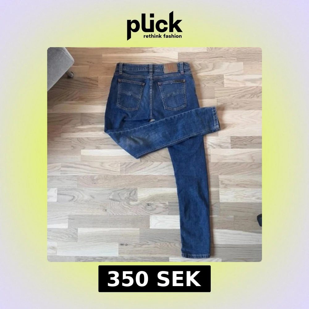 Säljer ett par snygga blå jeans från Nudie Jeans. De har en klassisk femficksdesign och är tillverkade i slitstarkt denim. Perfekta för en avslappnad stil. Skick 9/10, nypris runt 1600-1800kr😁