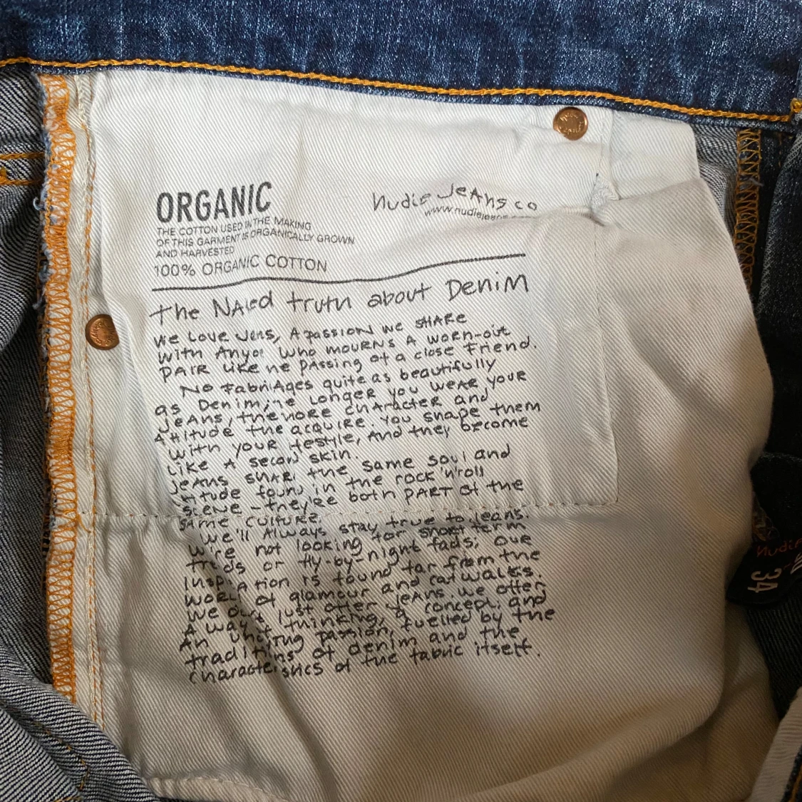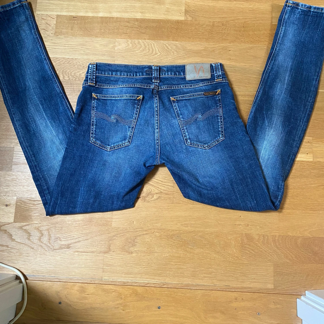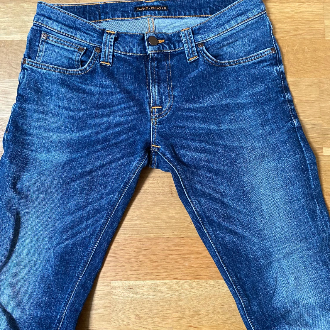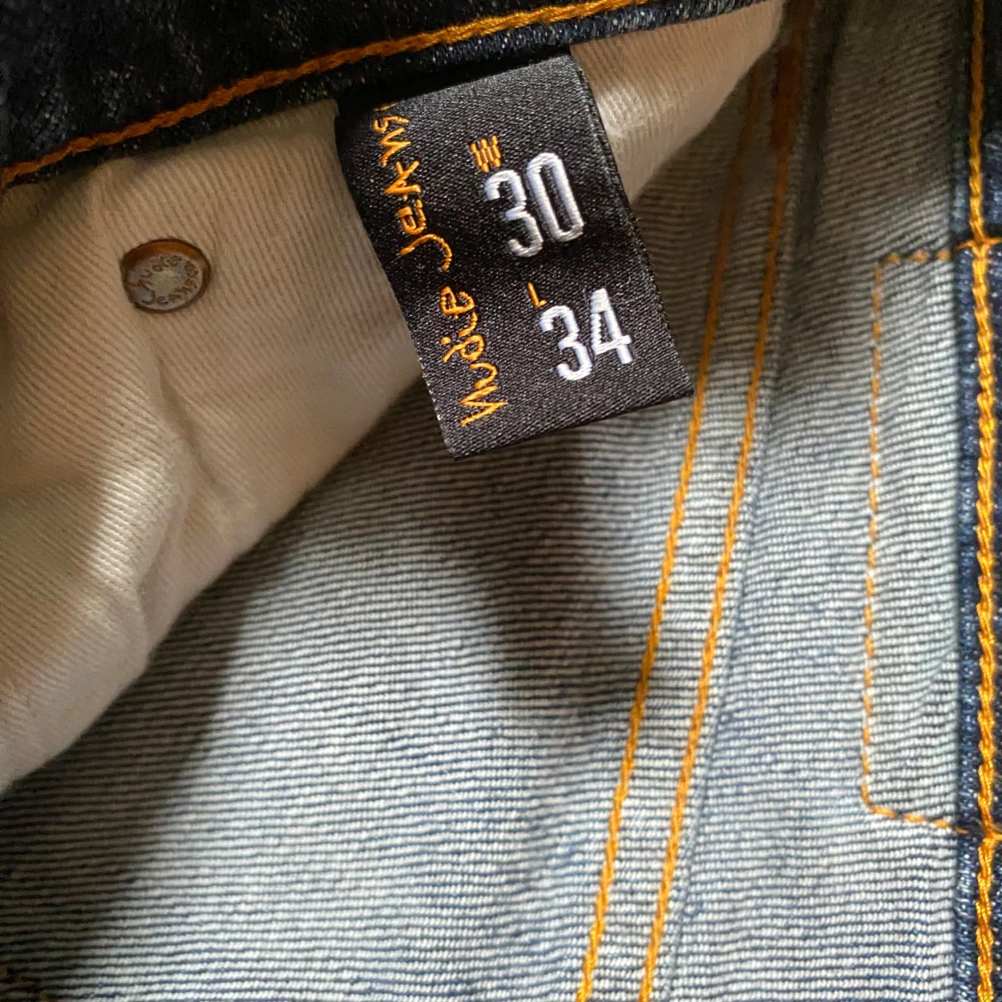 Säljer ett par klassiska blå jeans från Nudie Jeans i modellen 30/34. Jeansen är tillverkade av 100% ekologisk bomull och har snygga slitningar, orangea sömmar och femficksdesign. Perfekta för dig som gillar en tidlös och cool denimlook.