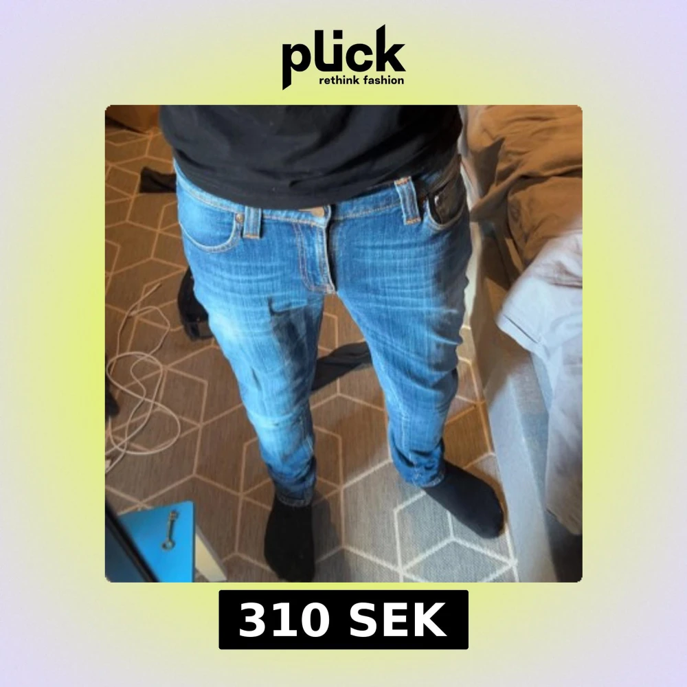 Säljer ett par klassiska blå jeans från nudie med snyggt slitna detaljer och raka ben. Jeansen har fem fickor, orange sömmar och läderpatch bak i midjan. Perfekta för dig som gillar en tidlös och avslappnad look.
