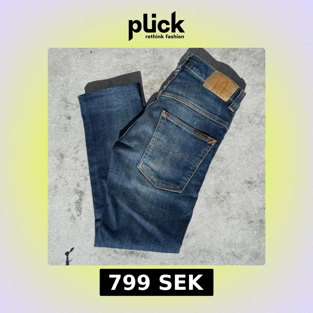 Snygga mörkblå jeans från Nudie Jeans med klassisk femficksdesign och kontrastsömmar. Jeansen har en rak passform och är tillverkade i slitstarkt denim med coola detaljer som Nudie-loggan på läderpatchen bak. Perfekta för dig som gillar stilrena och tidlösa jeans. Av klippta och sydda som ni ser på bild 4! Passar dig perfekt om du är ungefär 155!