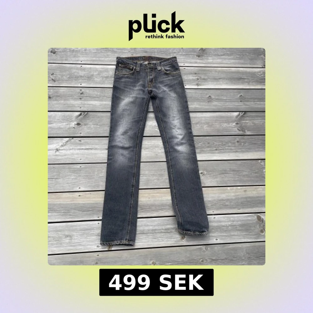 Snygga svarta jeans från Nudie Jeans med straight fit och slitna detaljer. Jeansen har orange kontrastsömmar och ikonisk brodering på bakfickorna. Tillverkade i mjuk bomullsdenim med dragkedja och knapp framtill. Jeansen ganska low waist, och helt oanvända.
